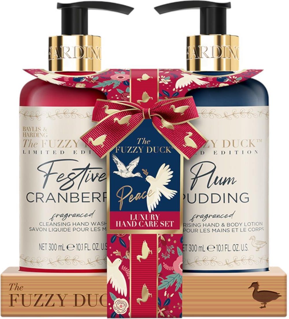 Baylis & Harding Zestaw Kosmetyków do Pielęgnacji Dłoni The Fuzzy Duck Baylis & Harding The Fuzzy Duck to elegancki zestaw do pielęgnacji dłoni, który łączy funkcjonalność z wyjątkowymi, świątecznymi zapachami. Idealny do codziennego użytku, wnosi odrobinę luksusu do każdej łazienki czy kuchni. W komplecie znajdziesz mydło do rąk Festive Cranberry 300 ml oraz balsam do rąk i ciała Plum Pudding 300 ml. Mydło skutecznie oczyszcza, pozostawiając dłonie świeże i pachnące, natomiast balsam intensywnie nawilża i odżywia skórę, otulając ją aromatem śliwkowego puddingu. Baylis & Harding Zestaw Kosmetyków do Pielęgnacji Dłoni The Fuzzy Duck to doskonały pomysł na prezent - elegancki, praktyczny i pachnący świątecznym klimatem. Stylowe butelki pięknie prezentują się przy umywalce, dodając wnętrzu wyjątkowego charakteru. Korzyści ze stosowania - Kompleksowa pielęgnacja dłoni i ciała - Świąteczne zapachy: żurawina i Plum Pudding - Stylowe opakowania ozdobią każde wnętrze - Idealny upominek na świąteczny czas Sposób użycia Umyj dłonie mydłem, następnie dokładnie spłucz wodą. Po osuszeniu skóry nałóż balsam i delikatnie wmasuj, aby zapewnić dłoniom i ciału miękkość oraz nawilżenie. Tylko do użytku zewnętrznego. Pojemność: 2 x 300ml