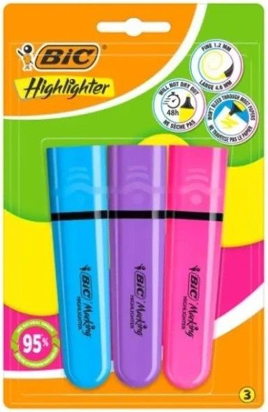 W opakowaniu znajdują się 3 zakreślacze BIC Marking Flat Pastel z tuszem w 3 pastelowych: niebieskim, różowym i fioletowym. Szybkoschnący tusz na bazie wody nie przesiąka przez papier i w 95% ma naturalny skład. Ścięta końcówka pozwala zarówno na szerokie zakreślanie (4,6 mm), jak i precyzyjne podkreślanie (1,2 mm). Płaski, zaokrąglony korpus dobrze leży w dłoni, a zatyczka umożliwia postawienie zakreślacza na biurku. Dzięki nowoczesnej technologii zakreślacz może pozostawać bez skuwki nawet do 48 godzin, nie tracąc swoich właściwości.