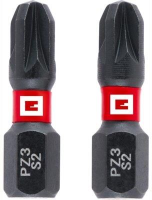 Zestaw dwóch wytrzymałych bitów skrętnych PZ3 S2 o długości 25 mm, wykonanych z wysokiej jakości stali S2, zapewniających trwałość i niezawodność podczas pracy.