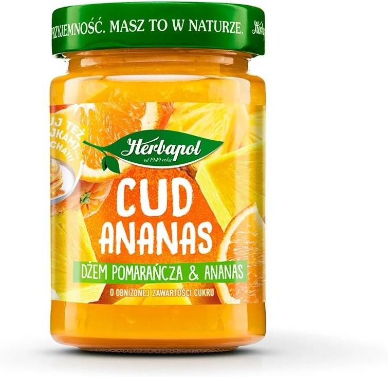 Herbapol Dżem Cud Ananas 280g Opis produktu Dżem pomarańcza z ananasem o obniżonej zawartości cukru, pasteryzowany Soczysty ananas w połączeniu z cytrusową świeżością pomarańczy. Smakuje świetnie z pankejkami i innymi śniadaniowymi klasykami. Przechowywać w suchym i zacienionym miejscu. Po otwarciu przechowywać w lodówce. 280 g Składniki owoce: pomarańcza 30%, ananas 15%, cukier, woda, substancja żelująca: pektyny, regulator kwasowości: kwas cytrynowy. Sporządzono z 45 g owoców na 100 g produktu. Wartość odżywcza w 100 g produktu: Wartość energetyczna – 603 kJ (142 kcal), Tłuszcz: <0,5 g (w tym kwasy tłuszczowe nasycone: <0,1 g), Węglowodany: 35 g (w tym cukry: 34 g), Białko: <0,5 g, Sól: <0,01 g. o obniżonej zawartości cukru* Łączna zawartość cukru 34 g na 100 g produktu. *Produkt zawiera ponad 30% mniej cukru niż dżemy o łącznej zawartości cukru 60 g na 100 g produktu. HERBAPOL DŻEMY