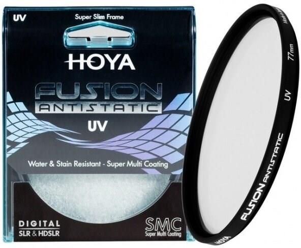 FUSION ANTISTATIC UV     Nowa seria filtrów Hoya – FUSION ANTISTATIC jest efektem fuzji dotychczasowej linii Pro1 Digital oraz nowej technologii powłok antystatycznych. Przeznaczona jest do pracy w niesprzyjających warunkach atmosferycznych i w środowisku o wysokim stopniu zakurzenia i zapylenia. Ma unikatową cechę wyróżniającą ją spośród wszystkich filtrów dostępnych na rynku – antystatyczną powłokę ochronną ANTISTATIC, która stanowi naturalną barierę chroniącą powierzchnię filtra przed kroplami wody, kurzem, drobnymi pyłkami czy odciskami palców. Dzięki niej utrzymanie filtra w czystości jest znacznie prostsze i nie wymaga stosowania dodatkowych środków do konserwacji optyki.   Powłoka ANTISTATIC jest odporna na działanie wody, zaplamienia i tłuste zabrudzenia, których usunięcie z powierzchni innych filtra może być kłopotliwe. Warto zwrócić uwagę, że zastosowana powłoka jest optycznie neutralna, zarówno pod względem barwnym jak i pracy pod światło. Stanowi tym samym niewidoczną dla oka i aparatu barierę, chroniącą obiektyw i powłoki antyrefleksyjne zastosowane w filtrze.   Filtry Hoya FUSION ANTISTATIC produkowane są w całości w Japonii, w oparciu o staranny proces ręcznego doboru i przetworzenia krzemianów, które w początkowym etapie procesu produkcji najpierw zostają stopione a następnie zmieszane ze sobą dla wytworzenia najwyższej jakości szkła optycznego. W późniejszym etapie ze szczególną ostrożnością i precyzją nanoszona jest 9-warstwowa, antyrefleksyjna i antystatyczna powłoka Super Multi Coating redukująca i eliminująca wszelkie odbicia i flary z powierzchni filtra, gwarantując przy tym transmisję światła na poziomie 99,8%. Dlatego właśnie stosowanie filtrów Hoya gwarantuje całkowitą neutralność kolorystyczną oraz wysoki kontrast na fotografiach i filmach. W konstrukcji wszystkich filtrów z serii FUSION ANTISTATIC wykorzystano lekką, jednoczęściową i niskoprofilową oprawkę aluminiową, która zapobiega winietowaniu podczas pracy z szerokokątnymi obiektywami.