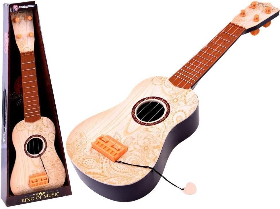 Zabawka gitara metalowe struny + piórko IN0095 Zabawka Gitara - instrument muzyczny w postaci gitarki jest to propozycja dla dzieci lubiących sprzęty muzyczne. Gabaryt gitary jest pomyślany o najmłodszych, dzięki czemu jest łatwy w utrzymaniu i graniu. Świetnie sprawdzi dla najmłodszych pociech kochających muzykę oraz pragnących szlifować pierwsze gitarowe chwyty. Gitara w całości wykonana jest z plastiku w imitacji koloru drewna, dzięki czemu sprawia profesjonalne wrażenie. Posiada 4 metalowe struny, regulacje na gryfie. Dźwięk jest czysty i miły dla ucha...a jak już ktoś umie grać na gitarze to już w ogóle bajka. Zestaw zawiera: - gitara - piórko Wymiar długość 54,5 cm szerokość 16,5 cm grubość 5,5 cm Gitara zapakowana jest w oryginalne opakowanie, dzięki czemu będzie świetnie nadawała się na prezent.