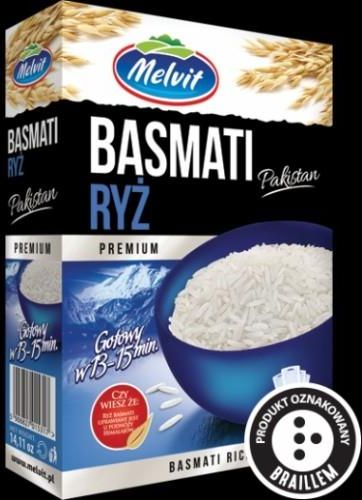 Melvit Ryż basmati 4 x 100g Możliwość zakupu w opakowaniu zbiorczym: 6 sztuk. Informacje dla alergików: produkt może zawierać orzechy, sezam, gluten. Sposób użycia/Zastosowanie: 1. zagotować 2 szklanki wody. Można osolić do smaku. 2. Do gotującej się wody wsypać 1 szklankę ryżu, opłukanego wcześniej w zimnej wodzie. 3. Gotować pod przykryciem, na wolnym ogniu do momentu wchłonięcia wody przez ryż 13-15 minut. Składniki: 100% ryż basmati. Wartość odżywcza w 100 g: wartość energetyczna 1480 kJ/349 kcal, tłuszcz 0,8 g, w tym kwasy tłuszczowe nasycone 0,3 g, węglowodany 76 g, w tym cukry 0,2 g, błonnik 0,7 g, białko 9,0 g, sól