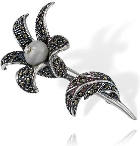 Norbisrebro Srebrna Oksydowana Broszka Z Markazytami - Efektowny Kwiat Perłą Jordanów