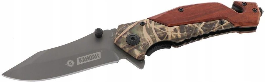 Nóż składany Głownia typu Clip point charakteryzuje się dobrą przebijalnością oraz dobrze sprawdza się przy precyzyjnych zadaniach Cechy produktu: Nóż wykonany z wysokiej jakości stali Stalowy uchwyt z nakładkami z tworzywa oraz drewna Klips umożliwia zapięcie na pasek Od spodu dodatkowe ostrze do przecinania oraz zbijak do szyb Rękojeść typu Frame lock Bardzo ostry Wygodnie leży w dłoni Scyzoryk składany Bardzo solidne wykonanie Długość ostrza: 8 cm Długość noża: 20,5 cm Długość noża złożonego: 12 cm