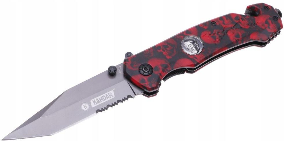 Nóż składany Głownia typu Clip point charakteryzuje się dobrą przebijalnością oraz dobrze sprawdza się przy precyzyjnych zadaniach Cechy produktu: Nóż wykonany z wysokiej jakości stali Stalowy uchwyt z nakładkami z tworzywa Klips umożliwia zapięcie na pasek Ostrze z piłką Od spodu dodatkowe ostrze do przecinania oraz zbijak do szyb Rękojeść typu Frame lock Bardzo ostry Wygodnie leży w dłoni Scyzoryk składany Bardzo solidne wykonanie Długość ostrza: 9,5 cm Długość noża: 23 cm Długość noża złożonego: 13,5 cm