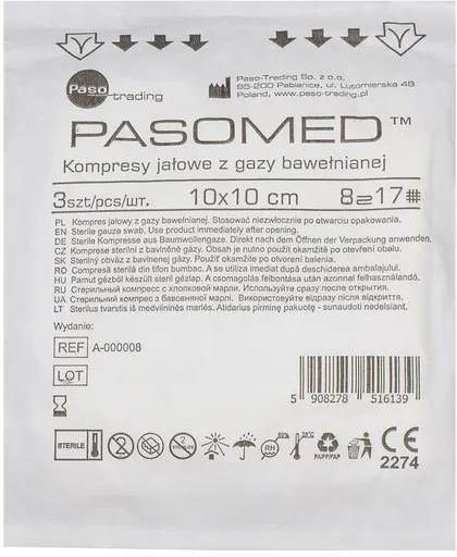 Opis: Pasomed Kompresy jałowe z gazy bawełnianej 17-nitkowe 8-warstwowe, 10 cm x 10 cm Pasomed Kompresy jałowe z gazy bawełnianej 10 cm x 10 cm to wyrób medyczny do jednorazowego użytku. Kompresy przeznaczone do bezpośredniego opatrywania uszkodzonej skóry, w celu pochłaniania wysięków, czyli naturalnego płynu, który pojawia się w ranie w procesie gojenia. Do stosowania na rany po zabiegach chirurgicznych oraz takich, które powstały w wyniku urazów..Skład: Kompresy jałowe wykonane w 100% z gazy bawełnianej..Sposób użycia: Jak stosować kompresy jałowe z gazy bawełnianej 10 cm x 10 cm Pasomed? Położyć jałowy kompres bezpośrednio na ranę Po przesiąknięciu opatrunku wymienić na nowy. Stosować nie dłużej niż 24 godziny od chwili założenia lub postępować według zaleceń lekarza. Używać do czasu zagojenia rany. .Zawartość opakowania: 3 szt. – 17 – nitkowe, 8-warstwowe.Dodatkowe: Po użyciu traktować jako odpad medyczny, czyli potencjalne źródło zakażenia. .Ostrzeżenia: Stosować niezwłocznie po otwarciu opakowania. Wyrób użytku jednorazowego, ponowne użycie jest zabronione, ponieważ grozi zakażeniem.Nie sterylizować powtórnie. To jest wyrób medyczny. Używaj go zgodnie z instrukcją używania lub etykietą..