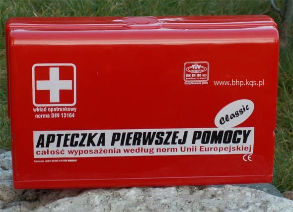 APTECZKA CLASSIC Wyrób spełnia wymagania norm Uni Europejskiej wg DIN 13164. Apteczkę poleca Sobiesław Zasada. Skład apteczki: 3 kpl. Kompres 10 x 10 cm (2 szt.) sterylny, 2 szt. Opaska elastyczna 4m x 6cm, 3 szt. Opaska elastyczna 4m x 8cm, 1 kpl. Plaster 10 x 6 cm (8szt.), 1 szt. Plaster 5m x 2,5 cm, 3 szt. Opatrunek indywidualny M sterylny, 1 szt. Opatrunek indywidualny G sterylny, 2 szt. Chusta opatrunkowa 40 x 60 sterylna, 1 szt. Chusta opatrunkowa 60 x 80 sterylna, 2 szt. Chusta trójkątna, 1 szt. Koc ratunkowy, 1 szt. Nożyczki 14,5 cm, 4 szt. Rękawice winylowe, 2 szt. Chusteczka alkoholowa, 1 szt. Ustnik do sztucznego oddychania, 1 szt. Instukcja udzielania pierwszej pomocy. Apteczka jest w dwóch rodzajach etui: 1. twarde - plastik, 2. miękkie - materiał.