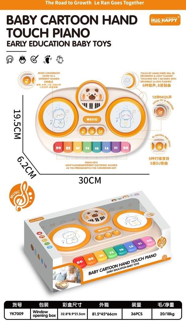 Opis Keyboard + Dotykowa Perkusja Misiu Dotykowe interaktywne pianinko dla dzieci od dwunastego miesiąca życia. Wykonane z trwałych i bezpiecznych dla dzieci materiałów w żywych kolorach przyciągających wzrok i zachęcających do zabawy. Pianinko posiada zmianę trybów, 6 różnych brzmień, 10 wesołych melodyjek i tryb DJ do kreatywnej zabawy dźwiękiem. Bębny wykonane z miękkiego materiału świecą i umożliwiają wystukiwanie rytmu rączkami. Kolorowe klawisze wydaję różne dźwięki w zależności od wybranego trybu, od klasycznych dźwięków po odgłosy zwierząt czy śmiechu dziecka. Zestaw pianinko z perkusją wprowadzi dziecko w świat muzyki, pomaga odkryć maluchowi dźwięki i rytmy. Zabawka zasilana jest zabawkami typu 3 x AA 1,5 V (brak w zestawie). Funkcje: dla dzieci od dwunastego miesiąca życia, wykonane z bezpiecznych dla dzieci materiałów w żywych kolorach, żywe kolory stymulują zmysły, zmiany trybów - 6 różnych brzmień, 10 wesołych melodyjek, tryb DJ do kreatywnej zabawa dźwiękiem, bębny wykonane z miękkiego materiału posiadają podświetlenie, kolorowe klawisze wydaję różne dźwięki zależne od wybranego trybu. Wymiary - pianinko ok. 6,2 cm x 19,5 cm x 30 cm, - opakowanie ok. 33 cm x 21,7 cm x 9 cm Zawartość zestawu - pianinko z perkusją