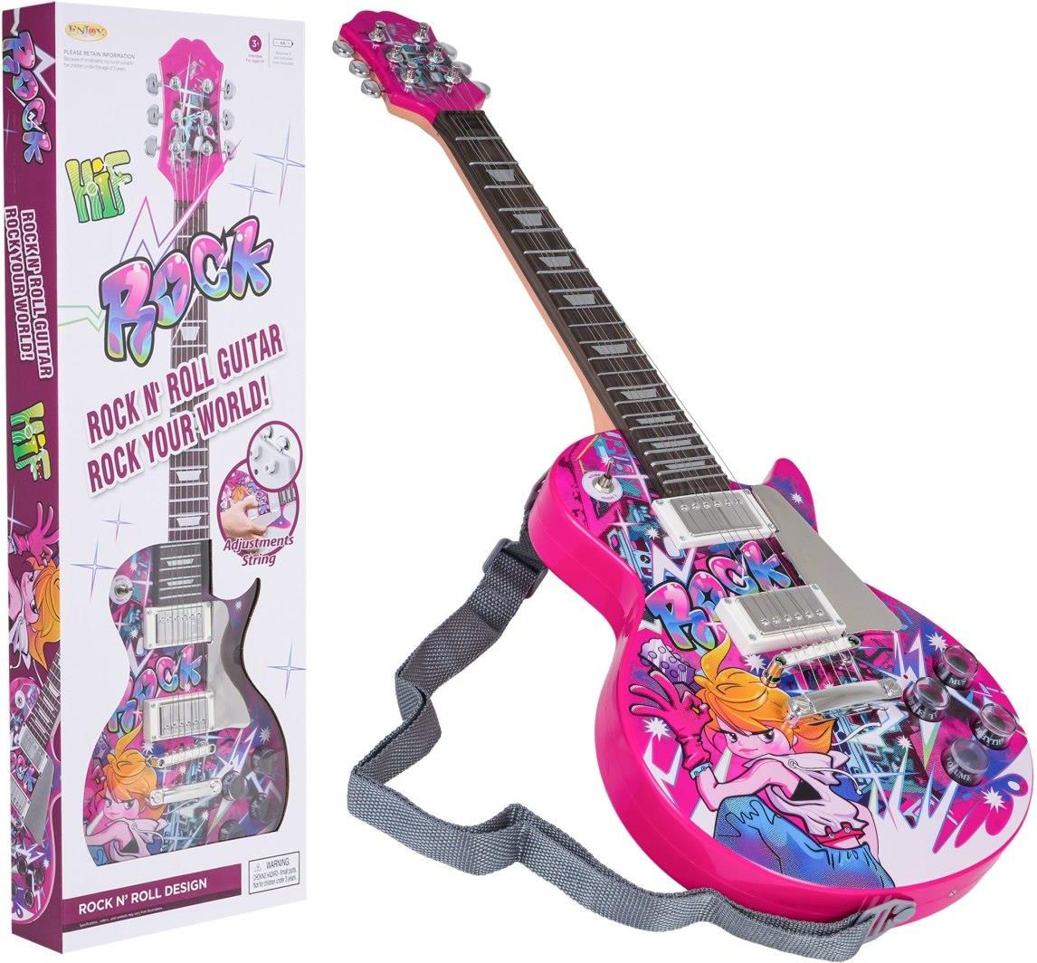 Opis Elektryczna gitara różowa Elektryczna gitara różowa, dla dzieci od trzeciego roku życia. Gitara posiada regulację głośności, różne rytmy, efekty dźwiękowe oraz osiem gotowych melodii. Zabawka zasilana jest bateriami typu 3 X AA 1,5 V (brak w zestawie). Funkcje zestawu: odpowiednia dla dzieci od trzeciego roku życia, wyglądem przypomina prawdziwy instrument, ćwiczy palce, wyrabia poczucie rytmu, regulacja głośności, wybór rytmów, gotowe podkłady muzyczne, efekty dźwiękowe. Wymiary gitara elektryczna ok. 69 cm x 23 cm x 5 cm, długość paska ok. 99 cm, opakowanie ok. 70,5 cm x 24 cm x 7 cm. Zawartość zestawu - różowa gitara elektryczna, - pasek.