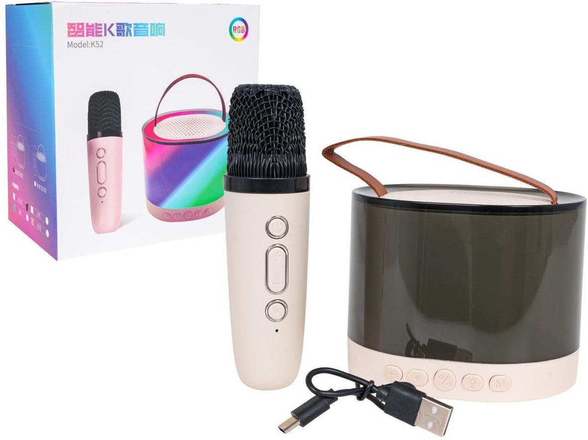 Opis Zestaw Karaoke Mikrofon + Podświetlany Głośnik Zestaw karaoke mikrofon i głośnik dla dzieci od trzeciego roku życia i dorosłych. Ten przenośny zestaw nie zajmuje dużo miejsca i jest lekki, więc można go zabrać wszędzie ze sobą. Niech nie zmyli was ten niewielki gabaryt, gdyż ten zestaw posiada bardzo wysoką jakość dźwięku, a także tworzy oszałamiające wrażenie wizualne dzięki oświetleniu RGB. Zaawansowana technologia dekodowania MP3 zapewnia czysty i mocny dźwięk. Głośniczek posiada układ redukcji szumów DSP, dzięki czemu dźwięk jest głośniejszy i pełniejszy. Bluetooth zapewnia stabilne połączenie. Zestaw jest kompatybilny z telefonami komórkowymi, telewizorami, tabletami, komputerami i innymi urządzeniami oraz z różnymi popularnymi aplikacjami. Głośnik posiada wejście na kartę 64G-TF, słuchawki i ładowarkę typu C. Wysokiej jakości uchwyt skórzany jest praktyczny i wytrzymały. Do wyboru mamy 5 efektów świetlnych LED, które synchronizują się z muzyką, tworząc niesamowite wrażenie wizualne. Krótkie naciśnięcie przycisku na głośniku zmienia efekty świetlne, przytrzymanie przez dwie sekundy wyłącza diody LED. Wskaźnik naładowania ułatwia używanie a wytrzymała obudowa, poziom ochrony IPx3 zapewnia ochronę przed deszczem i trwałość. Funkcje: dla dzieci od trzeciego roku życia i dorosłych, niewielki gabaryt i lekkość umożliwia noszenie go wszędzie przy sobie, bardzo wysoka jakość dźwięku, wbudowany akumulator: 2 x 3,7V, czas ładowania ok. 2-3 godziny, oświetlenie RGB, technologia dekodowania MP3, czysty i głośny dźwięk, redukcja szumu DSP, stabilne połączenie Bluetooth 5.0, kompatybilny z telefonem, tabletem, telewizorem, komputerem i innymi urządzeniami oraz różnymi aplikacjami, obsługuje pliki MP3/WMA/WAV, wejście na kartę 64G-TE, słuchawki i ładowarkę typu C, skórzany uchwyt głośnika, 5 efektów świetlnych LED, synchronizacja z muzyką, czas odtwarzania ok. 4-5 godzin, wytrzymała obudowa, ochrona IPx3. Wymiary głośnik ok. 11 cm x 9,2 cm x 8,5 cm, mikrofon ok. 13,4 cm x 3,7 cm, opakowanie ok. 15 cm x 15,5 cm x 9,8 cm. Zawartość zestawu mikrofon, głośnik, kabel do ładowania