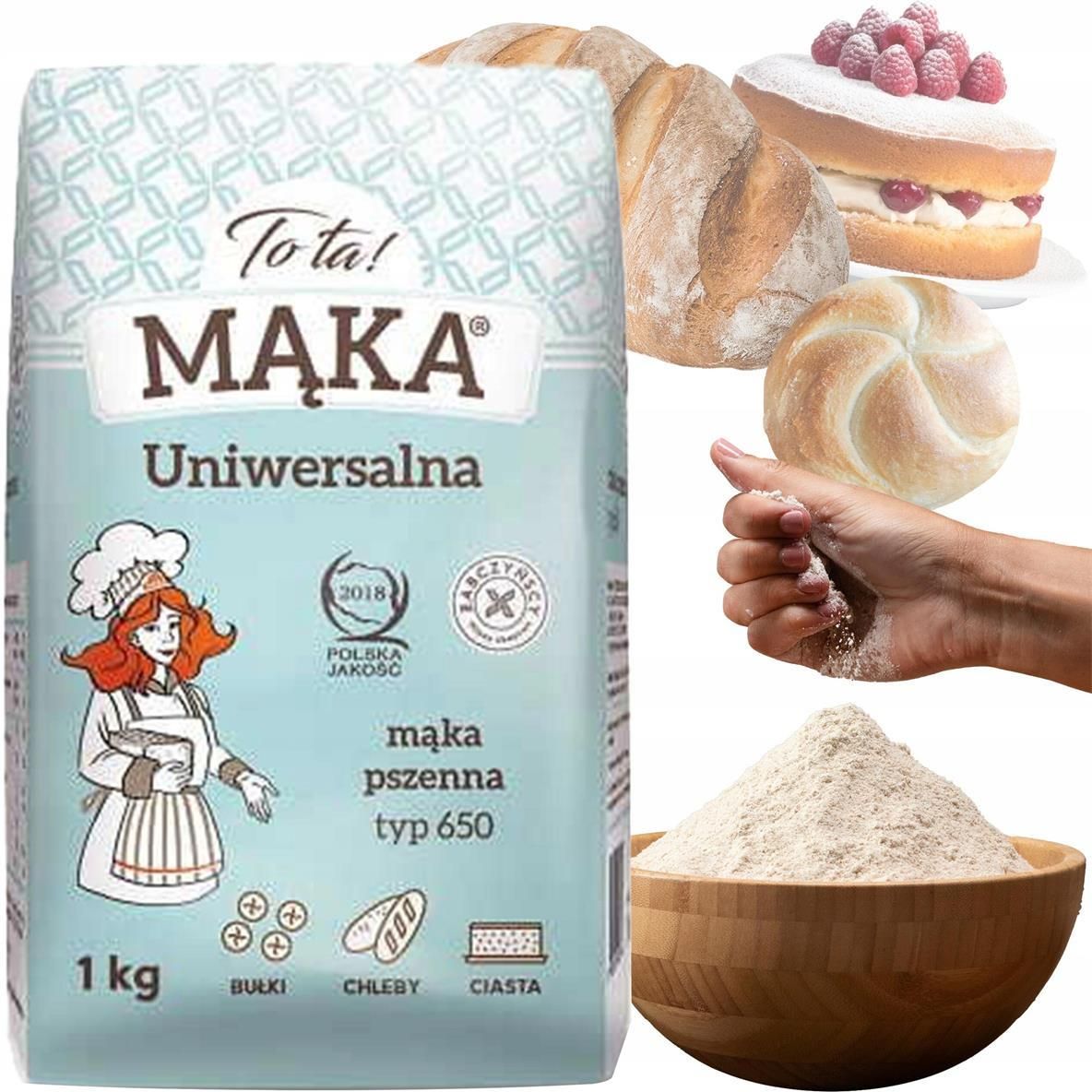 TOTA Mąka pszenna typ 650 uniwersalna 1kg Możliwość zakupu w opakowaniu zbiorczym: 10 sztuk. Mąka pszenna typ 650 uniwersalna 1kg to mąka polecana do wypieku bułek, pierników, ciast ciemnych, robienia zasmażek,do zagęszczania zup i sosów. Sprawdź nasz przewodnik po rodzajach mąki! Składniki Pszenica 100%. Wartość odżywcza w 100 g wartość energetyczna: 1460 kJ / 344 kcal 17 % Tłuszcz 1,2 g 2 % • w tym kwasy tłuszczowe nasycone 0,3 g 2 % Węglowodany 69,9 g 27 % • w tym cukry 2,2 g 2 % Błonnik 1,4 g - Białko 12,7 g 25 % Sól <0,01g 0 %