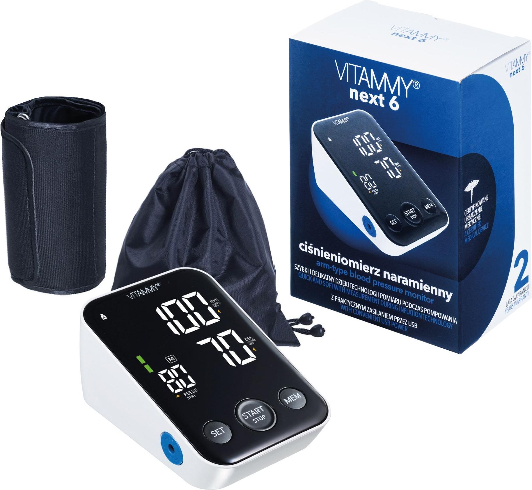 Pomiar Podczas Pompowania - technologia następnej generacji w NEXT 6 Next 6 to ciśnieniomierz naramienny, który niezwykle delikatnie, szybko i precyzyjnie zmierzy ciśnienie krwi, dzięki technologii pomiaru podczas pompowania, zwanej także pomiarem komfortowym. Pomiar podczas pompowania wykonywany jest w czasie, gdy urządzenie napełnia mankiet. Użytkownik odczuwa niewielki ucisk, a jest znacznie bardziej delikatny i zauważalnie szybszy. Użytkowanie tego ciśnieniomierza kojarzy nie kojarzy się z dyskomfortem. Znacznie przyjemniej jest kontrolować ciśnienie krwi z NEXT 6 z pomiarem podczas pompowania niż ciśnieniomierzem starszej generacji. 6 ciśnieniomierz na szóstkę NEXT 6 z kompletnej serii NEXT z technologią następnej generacji: Inflation Measurement (Pomiaru Podczas Pompowania) Usiądź, zrelaksuj się i posłuchaj Komunikaty głosowe w języku polskim to najbardziej czytelny przekaz najważniejszych informacji o Twoim ciśnienieniu krwii Relaksująca muzyka podczas pomiaru - nasz sposób na wyciszenie i zwiększenie precyzji odczytu. Funkcje diagnostyczne, które zwiększają wiarygodność zastosowań.  Wykrywanie nieregularnego rytmu serca (m.in. arytmii) Uśrednianie ostatnich 3 wyników pomiarów Interpretacja wyniku pomiaru według wytycznych WHO Mniej fałszywych wyników, nerwów i straconego czasu. Wyposażony w zaawansowaną sygnalizację prawidłowego założenia mankietu oraz sygnalizację poruszenia podczas pomiaru, które mogą mieć wpływ na prawidłowy wynik. Wysoki standard mankietu - możesz to poczuć Mankiet o podwyższonym standardzie wykonany z materiałów najwyższej jakości: zapewnia poczucie większego komfortu, zwiększa wygodę użytkowania dzięki łatwiejszemu zapinaniu i rozpinaniu, jest trwały i dłużej zachowuje swoje właściwości. 22-40 cm = Uniwersalny mankiet o dużym zakresie regulacji. Prawidłowy dobór rozmiaru mankietu to kolejny czynnik mający wpływ na rzetelność pomiar. Mankiet 22-40 cm jest idealny dla większości użytkowników. Duży, czytelny ekran, kontrastowy Ekran z podświetleniem o wysokiej rozdzielczości (HD). Duże kontrastujące cyfry, znaki i ikony - w każdych warunkach łatwe do odczytania informacje.  Praktyczne, ekologiczne i powszechne Dzięki możliwości zasilania przez gniazdo USB oszczędzasz i postępujesz ekologicznie, zyskując zdrowie. Na pewno masz już ładowarkę ze złączem micro USB. Sporo miejsca na wspólne dbanie o zdrowie.  2 tory pamięci po 120 wyników Stawiamy na trwałość Akrylowa warstwa ochronna ekranu i panelu sterującego chroni przed zarysowaniami i czynnikami zewnętrznymi. Możesz z satysfakcją korzystać ze swojego ciśnieniomierza każdego dnia. Certyfikowana wiarygodność - Twój doktor to lubi Next (1, 3, 5, 6, 7) to certyfikowane urządzenie medyczne posiadające Certyfikat CE (Certyfikat Zgodności) wydany przez autoryzowaną jednostkę notyfikowaną EU: TÜV SÜD PRODUCT SERVICE GMBH RIDLERSTR 65, D-80339 MÜNCHEN, NIEMCY. Zaznaj spokoju, używając ciśnieniomierza zgodne z szeregiem wymagań dotyczących wiarygodności pomiaru (badania kliniczne), odporności za zakłócenia elektromagnetyczne, bezpieczeństwa użytkowania, prawidłowego oznakowania produktu, itp. Seria ciśnieniomierzy Vitammy Next Wybierz swój nowy, doskonale dopasowany ciśnieniomierz z najbardziej kompletnej serii VITAMMY NEXT Vitammy Next 6 naramienny ciśnieniomierz elektroniczny, który przyda się w każdym domu. Vitammy Next 6 ma szereg przydatnych funkcji ułatwiających dokładny pomiar ciśnienia w domu bez konieczności wizyty w gabinecie lekarskim. Potrzeba kontrolowania ciśnienia każdego dnia ułatwia dbanie o siebie w każdym wieku. Mierzenie ciśnienia jest jednym z elementów dbania o dietę, witalność i zdrowie. Pomiar ciśnienia jest dokonywany za pomocą metody oscylometrycznej, która polega na badaniu zmian ciśnienia wywołanych w pompowanym mankietem pomiarowym. W pomiarze bardzo ważne jest odpowiednie założenie mankietu co znacznie ułatwione jest wz Vitammy Next 6 i wykrywaniem pozycji mankietu. Ciśnieniomierz wyróżnia się wykrywaniem arytmii i interpretacją wyników co jest ułatwieniem przy pomiarach u osób z schorzeniami. Pamięć i czytelny wyświetlacz sprawia że pomiar będzie codziennym nawykiem a nie obowiązkiem. Zestaw zawiera: ciśnieniomierz, mankiet/rękaw pomiarowy, etui do przechowywania, 3 baterie AAA, instrukcję z gwarancją. To urządzenie zostało wyprodukowane zgodnie z europejskimi normami: EN1060-1; EN1060-3; IEC 80601-2-30; ISO81060-1; IEC60601-1-11; IEC60601 1; Kompatybilność elektromagnetyczna: Urządzenie spełnia wymagania normy międzynarodowej IEC60601-1-2.