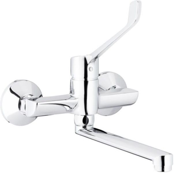 MEDICO NEW bateria kuchenna, ścienna Są takie miejsca, gdzie tradycyjne rozwiązania nie wystarczą i niezbędne są baterie do zadań specjalnych. Należą do nich między innymi łazienki szpitalne z umywalkami chirurgicznymi, toalety dla osób z niepełnosprawnościami czy też kuchnie w lokalach gastronomicznych. Z myślą o potrzebach w tych przestrzeniach, powstały baterie kolekcji Medico New – ze specjalnymi uchwytami, które z łatwością można odkręcać i zakręcać przykładowo łokciem, co jest kluczowe w przypadku lekarzy, ale i kucharzy z brudnymi dłońmi. Kolekcja Medico New to szeroka linia baterii specjalnych, łazienkowych i kuchennych z wylewkami o różnej długości, co sprawia, że można je dopasować do zróżnicowanych potrzeb. Dane techniczne: Kolor: chrom Montaż: 2-otworowy Typ: ścienna Materiał: mosiądz Element sterujący: regulator ceramiczny Ø35 Napowietrzacz: tak Przepływ wody [l/min]: 13,5 Ciśnienie robocze [atm]: 3 Temperatura wody [°C] maks.: ≤90/65 Grupa akustyczna: II Rozstaw przyłączy [mm]: 150±20 Wylewka: obrotowa Długość wylewki [mm]: 200 Opakowanie zawiera: mimośrody (2 szt.), rozety z uszczelkami (2 szt.). Gwarancja: 5 lat na szczelność elementów odlewanych oraz bezawaryjną pracę głowic ceramicznych. Certyfikatyi deklaracje: produkt wykonany zgodnie z normą PN-EN 817, posiada Atest higieniczny, deklarację zgodności.