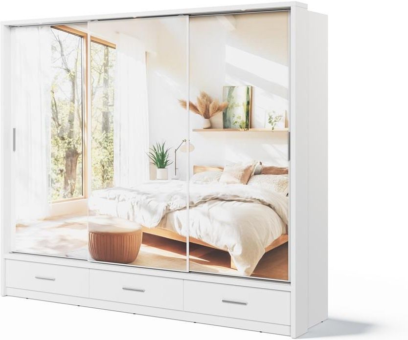 ARTI AR-01P-3L - Szafa 3D3S Przesuwna Z Oświetleniem Biała Funkcjonalna szafa ARTI z trzema drzwiami przesuwnymi i lustrami zapewni przestronność i porządek. Wyposażona w oświetlenie LED, regulowane półki oraz szuflady, idealnie komponuje się z każdym wnętrzem. Wymiary Szerokość (cm): 250 Wysokość …