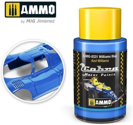 AMMO 0331 COBRA MOTOR Williams Blue - pasuje do Williams FW. AMMO COBRA MOTOR PAINTS AMMO Cobra Motor Paints to gama akrylowych, nietoksycznych kolorów, idealnych do malowania każdego obszaru karoserii, felg, opon, silników i wnętrz pojazdów. Farby AMMO Cobra Motor Paints są na bazie akrylu, ale po …