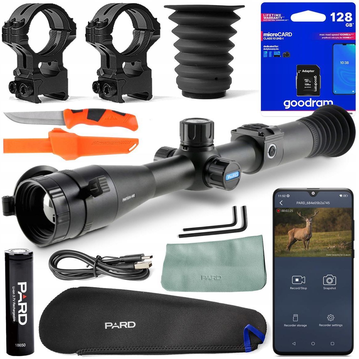 CELOWNIK TERMOWIZYJNY TERMOWIZOR PARD PANTERA 480 PA4-35 ZASIĘG 1800m +64GB Kupując u nas, kupujesz u Autoryzowanego Sprzedawcy urządzeń marki Pard. Tym samym masz pewność, że otrzymasz oryginalny produkt oraz pełne wsparcie pozakupowe. Luneta termowizyjna PARD Pantera PA4-35 w skrócie Zaawansowany sensor termiczny VOx 480 × 360 px – wysoka jakość obrazu i wykrywanie ciepła w każdych warunkach. Daleki zasięg detekcji do 1800 m – idealny do średnio- i dalekodystansowych polowań. Obiektyw 35 mm z ręcznym ostrzeniem – precyzyjna obserwacja i szerokie pole widzenia. Tryb PiP (obraz w obrazie) – jednoczesny podgląd powiększonego obrazu i pełnego pola widzenia. Kolorowe palety obrazu – wybór trybów: czarny gorący, biały gorący, czerwony, iron, sky i edge. Odporność IP67 – wodoodporność, pyłoszczelność i odporność na wstrząsy. Nagrywanie wideo z aktywacją strzałem – automatyczne nagrywanie 20-sekundowego wideo (8 s przed i 12 s po strzale). Łączność Wi-Fi i aplikacja mobilna – szybki transfer danych i zdalna obsługa. Wydajna bateria 18650 – do 6 h pracy, ładowanie przez USB-C. Kompaktowa i lekka konstrukcja (622 g) – wygodne użytkowanie w terenie. Zawartość zestawu Celownik termowizyjny PARD Pantera 480 PA4-35 Akumulator 18650 Pokrowiec Kabel USB Obejmy na szynę Picatinny Muszla oczna Karta gwarancyjna Instrukcja obsługi w języku polskim Karta pamięci Goodram microSDHC 64GB Class 10 UHS-I GRATIS Praktyczny nóż Alpina Sport Ancho GRATIS Dane techniczne Sensor termiczny [px]: VOx 480x360 NETD [mK]: <20 Częstotliwość odświeżania [Hz]: 50 Rozmiar piksela [µm]: 12 Ogniskowa obiektywu [mm]: 35 Zoom optyczny [×]: 2.1 Zoom cyfrowy [×]: 8 Kąt widzenia: 7.1º/7.1º/10.0° Zasięg obserwacji [m]: 1800 Odległość od oka [mm]: 100 Rozdzielczość wyświetlacza (szer. × wys.) [px]: 800x800 IPS Rozdzielczość zdjęć (szer. × wys.) [px]: 1536x1536 Rozdzielczość wideo (szer. × wys.) [px]: 768x768 Obsługa kart pamięci: Do 128 GB Klasa szczelności IP: IP67 Zasilanie: 1x ogniwo 18650 Czas pracy: Do 6h Temperatura pracy [°C]: -30 ~ +55 Moduł WiFi: Tak + dedykowana aplikacja PardVision2 Odporność na odrzut [J]: 6000 Żyroskop: Tak Kompas: Tak Wymiary (dł. × szer. × wys.) [mm]: 352 x 93 x 82 Masa [g]: 622 Symbol dostawcy: PA4-35 Celownik termowizyjny PARD Pantera PA4-35 – precyzja i niezawodność w każdych warunkach PARD Pantera PA4-35 to nowoczesny celownik termowizyjny, stworzony z myślą o myśliwych i strzelcach, którzy oczekują najwyższej jakości obrazu i niezawodności w każdych warunkach. Dzięki zaawansowanemu sensorowi termicznemu o rozdzielczości 480x360 pikseli i czułości termicznej NETD <200 mK, urządzenie pozwala na precyzyjne wykrywanie celu nawet w całkowitej ciemności, gęstej mgle czy deszczu. Zasięg detekcji do 1800 metrów oraz funkcja PiP (obraz w obrazie) pozwala na jednoczesne śledzenie szerokiego pola widzenia i szczegółowego powiększenia celu, co znacząco zwiększa precyzję oddawanych strzałów nawet na dalekich dystansach. Solidna konstrukcja o klasie szczelności IP67, długa żywotność baterii i możliwość nagrywania wideo sprawiają, że PARD Pantera PA4-35 wyróżnia się na tle konkurencyjnych modeli, oferując niezawodność i wszechstronność w każdych warunkach terenowych. Zaawansowany sensor termiczny – skuteczna detekcja w każdych warunkach Sercem celownika jest wysokoczuły sensor termiczny o rozdzielczości 480 × 360 px i czułości , który pozwala na wykrycie nawet niewielkich różnic temperatur. Dzięki temu użytkownik może namierzać cel na dystansie do 1800 metrów, co jest szczególnie istotne podczas nocnych polowań oraz obserwacji w trudnych warunkach terenowych. Wyraźny obraz i szerokie pole widzenia Celownik został wyposażony w obiektyw o średnicy 35 mm, który zapewnia szerokie pole widzenia oraz precyzyjny obraz na średnich i dalekich dystansach. Okrągły wyświetlacz IPS LCD o rozdzielczości 800 × 800 px oraz częstotliwości odświeżania 50 Hz gwarantuje płynne odwzorowanie obrazu, ułatwiając identyfikację celu nawet w dynamicznych sytuacjach. Funkcja PiP – precyzyjne namierzanie Technologia PiP (obraz w obrazie) to rozwiązanie, które pozwala na jednoczesne śledzenie szerokiego pola widzenia i szczegółowego powiększenia celu. Funkcja ta znacząco zwiększa precyzję oddawanych strzałów, co jest szczególnie przydatne podczas obserwacji na dużych odległościach. Odporność i niezawodność w terenie PARD Pantera PA4-35 został zaprojektowany z myślą o użytkowaniu w trudnych warunkach. Solidna obudowa spełnia normy IP67, co oznacza, że urządzenie jest wodoodporne, pyłoszczelne i odporne na wstrząsy. Dzięki temu celownik sprawdzi się zarówno w deszczowe noce, jak i podczas intensywnych polowań w wymagającym terenie. Sześć trybów obrazu – dostosowanie do warunków terenowych PARD Pantera PA4-35 oferuje sześć trybów wyświetlania obrazu: White Hot, Black Hot, Sky, Iron Hot, Red Hot Edge. Każdy z nich pozwala na dostosowanie widoczności celu w zależności od warunków terenowych i pogodowych. Tryb White Hot doskonale sprawdza się przy wykrywaniu ciepłych obiektów na chłodnym tle, natomiast Black Hot podkreśla cieplejsze sylwetki na jaśniejszym tle. Pozostałe tryby, takie jak Red Hot czy Iron Hot, pomagają w jeszcze dokładniejszym wykrywaniu obiektów w gęstej roślinności lub na zróżnicowanym terenie. Personalizowane siatki celownicze Urządzenie wyposażono w 6 rodzajów siatek celowniczych, które można dostosować do własnych preferencji. Użytkownik ma możliwość wyboru spośród 4 kolorów – czerwonego, zielonego, białego i żółtego, co ułatwia dopasowanie celownika do panujących warunków oświetleniowych. Dzięki regulowanej jasności, siatki pozostają czytelne zarówno w całkowitej ciemności, jak i podczas zmieniających się warunków atmosferycznych. 