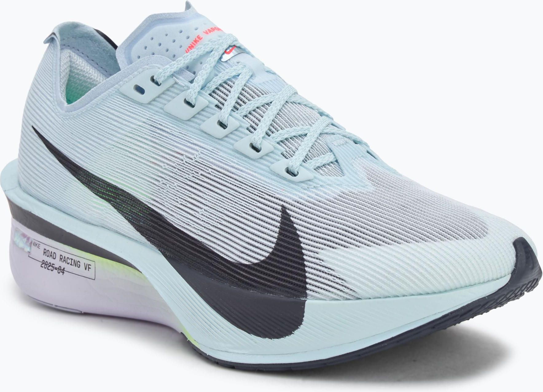 Buty do biegania damskie Nike Vaporfly 4 glacier blue/blue tint/gridiron zaprojektowano z myślą o biegaczkach oczekujących maksymalnej dynamiki na nawierzchniach asfaltowych. W konstrukcji zastosowano nowoczesne technologie zapewniające zaawansowaną amortyzację, lekkość oraz optymalne dopasowanie dla stopy neutralnej. Zaawansowana technologia amortyzacji ZoomX Podeszwa środkowa oparta na piance ZoomX oferuje znakomity zwrot energii przy każdym kroku, co przekłada się na skuteczniejsze przyspieszenie podczas biegów startowych. W modelu Nike Vaporfly 4 wykorzystano ponadto płytkę Flyplate, która stabilizuje przetoczenie stopy i poprawia efektywność odbicia. Dodatkowe wzmocnienie stanowi obecność gumy Blown Rubber w podeszwie zewnętrznej, zapewniającej przyczepność nawet na mokrym asfalcie. Lekka i oddychająca cholewka z siatki Konstrukcja cholewki wykorzystuje materiał siatkowy typu engineered mesh, gwarantując wysoką oddychalność oraz szybkie odprowadzanie nadmiaru ciepła. Standardowa szerokość cholewki umożliwia precyzyjne dopasowanie do większości stóp, co wpływa na komfort nawet podczas intensywnego wysiłku. Sznurówki zapewniają klasyczny sposób mocowania i skuteczne trzymanie stopy przez cały dystans. Buty do biegania damskie Nike Vaporfly 4 glacier blue/blue tint/gridiron - cechy: Pianka ZoomX w podeszwie środkowej dla maksymalnej amortyzacji i zwrotu energii; Płytka Flyplate poprawiająca efektywność i stabilność odbicia; Cholewka z przewiewnej siatki engineered mesh wspierająca oddychalność; Podeszwa zewnętrzna z gumy Blown Rubber gwarantująca przyczepność na asfalcie; Projekt dedykowany biegaczkom o neutralnej stopie; Drop 6 mm sprzyjający dynamicznemu biegu; Lekka konstrukcja zoptymalizowana pod kątem startów; Tradycyjne sznurowanie umożliwiające precyzyjne mocowanie stopy; Model przeznaczony do zawodów i szybkich treningów na twardych nawierzchniach; Zaawansowana amortyzacja wspierająca komfort na długich dystansach; Skuteczne odprowadzanie ciepła podczas intensywnego wysiłku.
