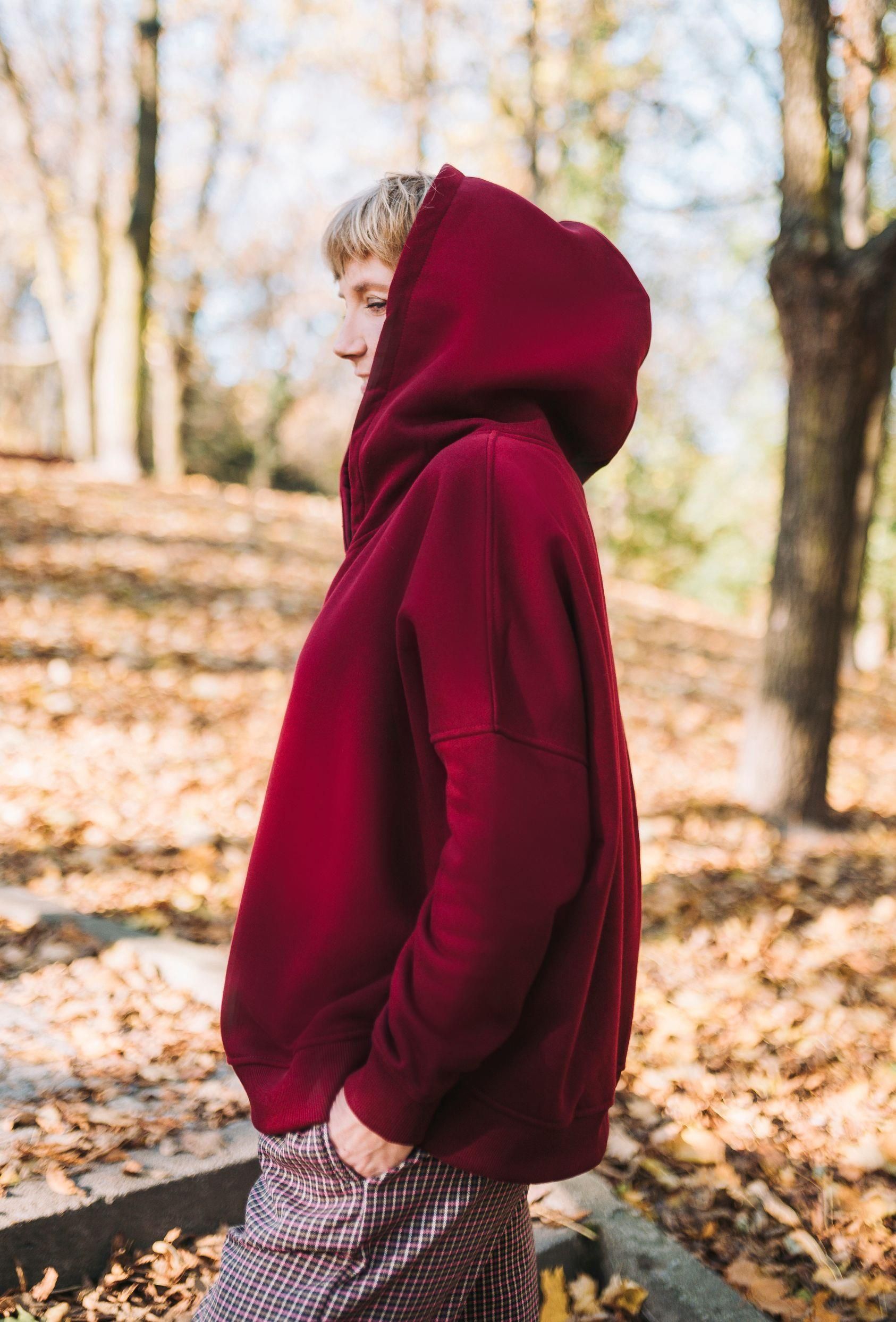 KOLOR: BORDOWY Bawełna 90%, poliester 10% Dzianina dresowa. GRAMATURA: 280 G/M2 Klasyczna bluza oversize z obszernym kapturem oraz dekoltem w kształcie litery V, który ładnie wydłuża szyję. Zaprojektowana i uszyta w Polsce. • obniżona linia ramion, • szeroki krój, • zwężające się ku dołowi rękawy, …