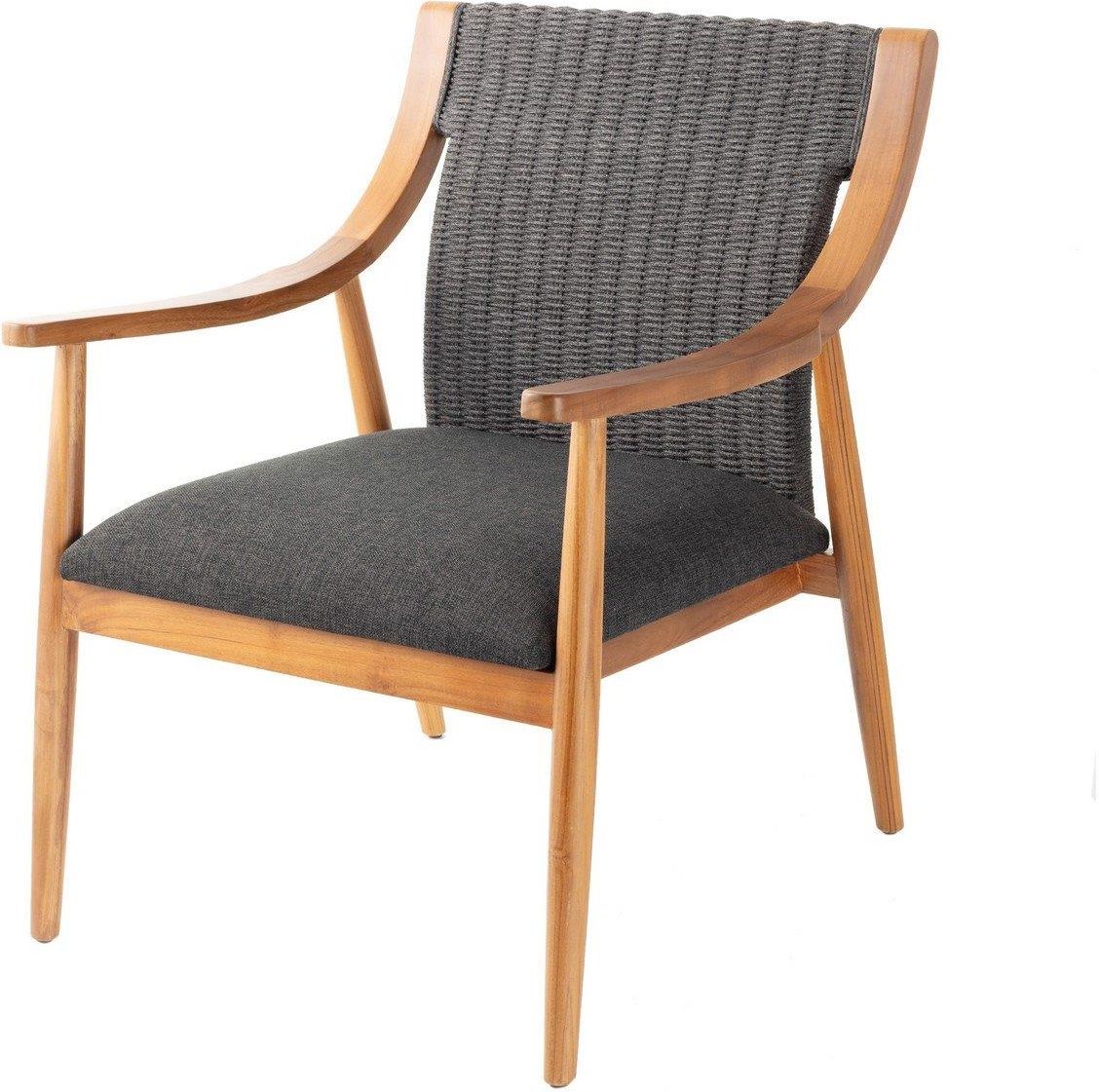 Fotel do salonu z plecionym oparciem w szarym kolorze. Elegancki fotel o unikatowym designie to wspaniała propozycja do wnętrz urządzonych w stylu boho czy skandynawskim. Pięknie plecione oparcie nadaje mu wyjątkowości, czyniąc unikatowym dodatkiem każdego stylowego wnętrza. Klasyczne linie podłokietników i nóżek wykonanych z drewna tekowego w połączeniu z wygodnym siedziskiem oraz plecionym oparciem, gwarantują komfort i doskonałe miejsce do relaksu. Ten praktyczny mebel posłuży zarówno jako designerski element wyposażenia wnętrza jak i dodatkowe siedzisko. Fotel wspaniale sprawdzi się umieszczony w salonie, gabinecie czy sypialni w towarzystwie innych mebli o podobnej stylistyce. Wymiary: szer. 62 cm, gł. 70 cm, wys. 83 cm, wys. od podłogi do siedziska: 45 cm.Materiał: drewno tekowe / tkanina obiciowa 100% poliester / sznur. Uwaga! Kolor oparcia różni się kolorystycznie od koloru siedziska.