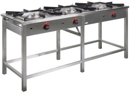 Cechy: • palnik posiada dwa pierścienie ognia (palniki dwukoronowe), które równomiernie ogrzewając dno naczynia zwiększają efektywność wykorzystania gazu, • zawór z zabezpieczeniem przeciwwypływowym odcina dopływ gazu w przypadku zgaśnięcia płomienia, • możliwość ustawienia kurkiem tzw. „oszczędnego płomienia”, • w zależności od potrzeb można wykorzystać palniki o różnej mocy, • zapalacze piezoelektryczne • wyjmowane płyty podpalnikowe ułatwiają utrzymanie urządzenia w czystości, • rurowe przyłącze gazu 1⁄2 ”, • konstrukcja wytrzymuje obciążenia do 100 kg na każdy palnik, • zastosowano nóżki z regulowaną wysokością, • mogą być zasilane gazem ziemnym G 20 (dawny GZ-50) lub gazem płynnym G 30 (propan, lub propano-butan PB), • obudowy urządzeń wykonane są ze stali nierdzewnej, • wbudowane palniki mają średnicę 130 mm. Dane techniczne: Długość1690 mm Głębokość600 mm Wysokość850 mm Moc grzewcza21,0 kW Ilość palników3 Materiał wykonaniastal nierdzewna Zasilanie palnikówgazowe Rodzaj gazugaz ziemny/propan, butan (do wyboru) Maksymalne obciążenie palnika100 kg