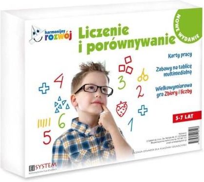 Pakiet zawiera interaktywne gry przystosowane do zespołowego wykorzystania na tablicy multimedialnej, karty pracy do kopiowania zawierające ćwiczenia do pracy indywidualnej, grę edukacyjną wykonaną z kartonów o dużym formacie, przeznaczoną do gry na dywanie, do używania przez całą klasę lub duże grupy dzieci, poradnik metodyczny. Gry interaktywne Dopasuj równoliczne – pomaga w rozwijaniu umiejętności liczenia i porównywania, wprowadza też element abstrahowania liczby. Ćwiczy percepcję wzrokową, koordynację wzrokowo-ruchową i uczy pracy w parach. Ułóż po kolei – pomaga w rozwijaniu umiejętności liczenia i porównywania liczb oraz zrozumienia pojęcia zbioru. Ćwiczy pracę w parach. Rachmistrze – to ćwiczenie umiejętności liczenia. Rozwija zdolność analizy wzrokowej, klasyfikowania i liczenia. Karty pracy Ułóż po kolei Połącz pasujące Od najmniejszego do największego Ułóż ołówki Gąsienica Owocowe szlaczki Kolorowanka z cyframi Ile jest prostokątów? Tyle samo – obrazki Tyle samo – cyfry Mniej czy więcej? Mały, średni, duży Gra wielkoformatowa Gra wielkoformatowa „Zbiory i liczby” składa się z dużych kartonów, na których znajdują się liczby od 1 do 10, odpowiadające im zbiory kropek oraz rysunki konkretnych przedmiotów. Grę uzupełniają znaki działań matematycznych oraz znaki różności. Podstawowa zabawa polega na dopasowywaniu przez trzy grupy dzieci kartonów reprezentujących te same liczby w każdy z wyżej opisanych sposobów. Inne zabawy to układanie liczb i zbiorów w kolejności rosnącej lub malejącej oraz porównywanie zbiorów. Gra pomaga w rozwijaniu umiejętności liczenia i znajdowania zbiorów równolicznych na obiektach konkretnych z przechodzeniem do liczenia abstrakcyjnego oraz we wprowadzaniu pojęcia liczby wyrażonej zapisem pojedynczej cyfry. Dołączone do gry kartony ze znakami dodawania, odejmowania i równości pozwalają na wykorzystanie gry również do układania i uzupełniania działań. W Poradniku zawarto propozycje scenariuszy zabaw.