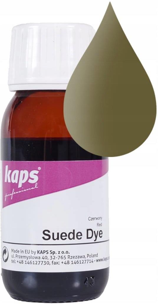 SUEDE DYE 50 ML OLIWKA - KAPS PROFESSIONAL (04_1_5044_139#) BARWNIK SUEDE DYE KAPS Specjalny barwnik do zamszu i nubuku. Preparat pozwala naprawić zniszczone powierzchnie skóry, Pozwala zmienić kolor z jasnego na ciemny, Podczas barwienia można uzyskać wysoki efekt, bez obawy, że barwnik przeniknie do innych części obuwia, Nie stosować do skór gładkich, Nawet po długim czasie kolor nie ulega płowieniu i matowieniu, Barwnik nadaje skórze głęboki kolor. Pojemność: 50 ml Sposób aplikacji Za pomocą szczotki usunąć brud i kurz z obuwia. Wstrząsnąć butelką. Nakładać za pomocą pędzelka. Nałożyć drugą warstwę barwnika, jeśli to konieczne. Pozostaw na 12 godzin w suchym miejscu. Po barwieniu delikatnie wyszczotkuj zamsz lub nubuk.
