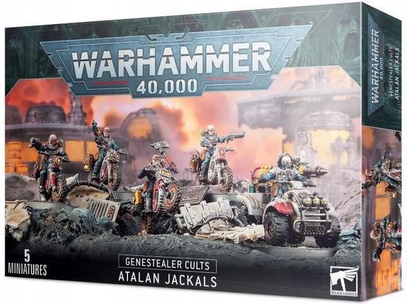UWAGA! ZAMÓWIENIE PRZEDPREMIEROWE. WYSYŁKA JAK I ODBIÓR OSOBISTY, NAJPÓŹNIEJ W DNIU PREMIERY. PREMIERA PRZEWIDZIANA JEST NA 9 LUTY 2019 SKLEP NIE PONOSI ODPOWIEDZIALNOŚCI ZA ZMIANĘ DATY PREMIERY Atalan Jackals are fourth generation Neophytes who form the outriders of their gene-sect. They roam the corners of the host planet in search of new regions for their cult to infest. Atalan Jackals provide fast-moving firepower and rapid assault support for your Genestealer Cults army. Capable of traversing the battlefield with incredible speed, they're great for exploiting weak points in your opponent's line or snatching key objectives. This set builds one squad of 5 Atalan Jackals – four on dirtcycles, accompanied by an Atalan Wolfquad. You'll be able to customise your squads with a host of melee weapons, blasting charges and ranged weapons, letting you kit the unit out for a range of battlefield roles. Likewise, the Wolfquad features options for a mining laser, Atalan incinerator or heavy stubber, offering you even more flexibility. All arms in the kit are interchangeable with one another, and you'll have a huge choice heads and accessories to individualise your models. This kit is supplied in 89 plastic components and contains 4x 60mm oval bases and 1x 60mm round base.