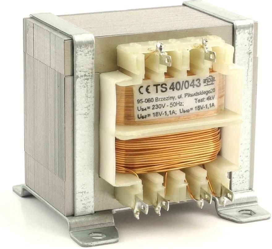 TRANSFORMATOR SIECIOWY TS40/043 230V 2x 18V - 2x 1,1A INDEL Symbol: 19922 TRANSFORMATOR SIECIOWY TS40/043 230V 2x 18V - 2x 1,1A INDEL TS - transformatory sieciowe małej mocy Seria transformatorów sieciowych wykonanych na rdzeniach kształtkowych EI, LL oraz zwijanych ciętych CP. Przeznaczone głównie do wbudowania w układach zasilających urządzeń elektronicznych. Produkowane w zakresie mocy: 1 - 250VA Budowa rdzeń kształtkowy EI, LL lub zwijany cięty CP korpus dwukomorowy z przegrodą wykonany z poliamidu wzmocnionego włóknem szklanym drut nawojowy miedziany z pojedynczą lub podwójną izolacją w klasie temperaturowej B, F lub H materiał izolacyjny estrofol lub preszpan impregnat lakier elektroizolacyjny zabezpieczenia - większość transformatorów jest nieodporna na zwarcie - należy stosować w obwodach PRI lub SEC wyłączniki termiczne, warystory, bezpieczniki topikowe sposób wyprowadzeń końcówkami do druku, oczkowymi, przewodami, lub innymi według uzgodnień elementy mocujące - podstawy, obejmy, wsporniki, tulejki gwintowane, listwy mocujące itp. istnieje możliwość zastosowania ekranowania uzwojeń lub całego transformatora Cena dotyczy 1 sztuki Specyfikacja➖ Napięcie pierwotne: 230V AC 50Hz Napięcie wtórne: 2x 18V AC Prąd uzwojenia wtórnego: 2x 1,1A Moc: 40VA Typ rdzenia: EI 66/33 Numery końcówek uzwojenia pierwotnego: 2-4 Numery końcówek uzwojenia wtórnego: 10-9 oraz 7-6 klasa cieplna Ta 40B (temp. otoczenia 40ºC, izolacja klasy B 130ºC) test izolacji 4 kV / 60 s stopień ochrony IP00 klasa izolacji II ! ! ! UWAGA ! ! !➖ Jesteśmy sprzedawcą elektroniki z wieloletnim doświadczeniem na rynku. Wszystkie nasze produkty, przed wysłaniem do klienta są szczegółowo sprawdzane na naszym serwisie a następnie bezpiecznie pakowane. Konstrukcja transformatorów toroidalnych powoduje, że nie są one odporne na uszkodzenia mechaniczne lub upadki. Z uwagi na powyższe po odebraniu i rozpakowaniu prosimy o bardzo delikatne obchodzenie się z transformatorami. Jeśli jest to możliwe, prosimy Państwa o sprawdzenie miernikiem rezystancji (przejścia) uzwojenia pierwotnego i wtórnego transformatorów przed ich podłączeniem. Uszkodzenia (przerwy) uzwojenia spowodowane udarami mechanicznymi (są one zawsze widoczne na izolacji zewnętrznej transformatora w postaci obicia lub przetarcia) nie są objęte gwarancją!