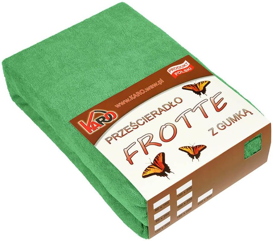 Prześcieradło frotte z gumką 140x200 zielone groszkowe grube 200g/m2 KARO KARO Prześcieradło frotte z gumką 140x200 zielone groszkowe 015 grube 200g/m2 KARO jest miękkie i przyjemne w dotyku, a spanie na nim to czysta przyjemność. Szeroka gama kolorystyczna pozwoli na dopasowanie koloru prześcieradła do każdej pościeli. Z kolei wysoka jakość zastosowanych materiałów sprawi, że długo będziesz cieszyć się wyborem prześcieradła KARO. Prześcieradło zachowuje swój fason i utrzymuje intensywny kolor nawet po wielu praniach. Rozmiar: 140x200 cm. Skład tkaniny: 82% bawełna, 18% poliester. Materiał: frotte - lekko rozciągliwy i niewymagający prasowania, dzięki czemu jest wyjątkowo wygodny w użytkowaniu. Gramatura: 200 g/m2 - najgrubsze prześcieradło na polskim rynku. Zakład prześcieradła wynosi ok. 15 cm i nie jest wliczany do rozmiaru. Prześcieradło przeznaczone jest na materace o wysokości do 15 cm, a zakład liczony jest na rogu prześcieradła. Dzięki bokom z narożnymi zaszewkami, profilującymi prześcieradło do kształtu materaca oraz gumce poprowadzonej w tuneliku produkt doskonale dopasowuje się i układa na materacach o różnej grubości. Przepis konserwacji: prać w temperaturze do 40°C, nie wybielać, nie prasować, nie czyścić chemicznie, suszyć w stanie rozwieszonym. Prześcieradła frotte z gumką KARO występują w wielu rozmiarach tj. m.in.:60x120, 70x140, 80x160, 90x200, 120x200, 140x200, 160x200, 180x200, 200x220 w ponad 40 kolorach. Kod produktu: 207251 Kod kreskowy: 5904941801977