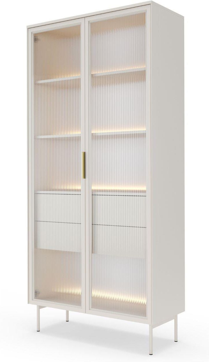 Elegancja w nowoczesnym wydaniu – tak najkrócej można opisać witrynę LUMI A w kolorze kaszmir. To mebel, który łączy funkcjonalność z wyjątkową estetyką, tworząc w pomieszczeniu przytulny i stylowy klimat.Fronty witryny wykonano z hartowanego szkła ornamentowego flutes, osadzonego w ramkach MDF w dekorze kaszmir, co daje subtelny efekt półprzezroczystości i nadaje meblowi wyjątkową lekkość. Za szkłem kryje się wnętrze o jasnym wykończeniu, rozświetlone oświetleniem LED w barwie neutralnej, które pięknie eksponuje zawartość witryny – porcelanę, szkło lub dekoracje.Wymiary:szerokość 91,5 cm / wysokość 194,6 cm / głębokość 39,3 cmFronty witryny wykonano z hartowanego szkła ornamentowego flutes, osadzonego w ramkach MDF w dekorze kaszmir, co daje subtelny efekt półprzezroczystości i nadaje meblowi wyjątkową lekkość. Za szkłem kryje się wnętrze o jasnym wykończeniu, rozświetlone oświetleniem LED w barwie neutralnej, które pięknie eksponuje zawartość witryny – porcelanę, szkło lub dekoracje.Korpus wykonano z płyty laminowanej w kolorze kaszmir z obrzeżem ABS, co zapewnia trwałość i estetyczne wykończenie.Uwagę zwracają również metalowe uchwyty w kolorze złotej anody, które w połączeniu z metalowymi nogami lakierowanymi na kaszmir tworzą spójną, elegancką całość.Wnętrze witryny kryje cztery półki oraz dwie pojemne szuflady na prowadnicach kulkowych z pełnym wysuwem, gwarantujących komfort użytkowania. To idealne miejsce na przechowywanie dokumentów, tekstyliów czy drobiazgów, które chcesz mieć zawsze pod ręką, ale dyskretnie ukryte.Produkt objęty jest 2-letnią gwarancją.Produkt dostarczymy do Państwa BEZPŁATNIE pod wskazany adres na terenie całego kraju.Mebel wymaga krótkiego montażu, zgodnie z załączoną instrukcją.Co WAŻNE: zgodnie z prawem i naszymregulaminemmają Państwo pełne prawo do zwrotu nieużywanych towarów, jeśli nie spełnią one Państwa oczekiwań.