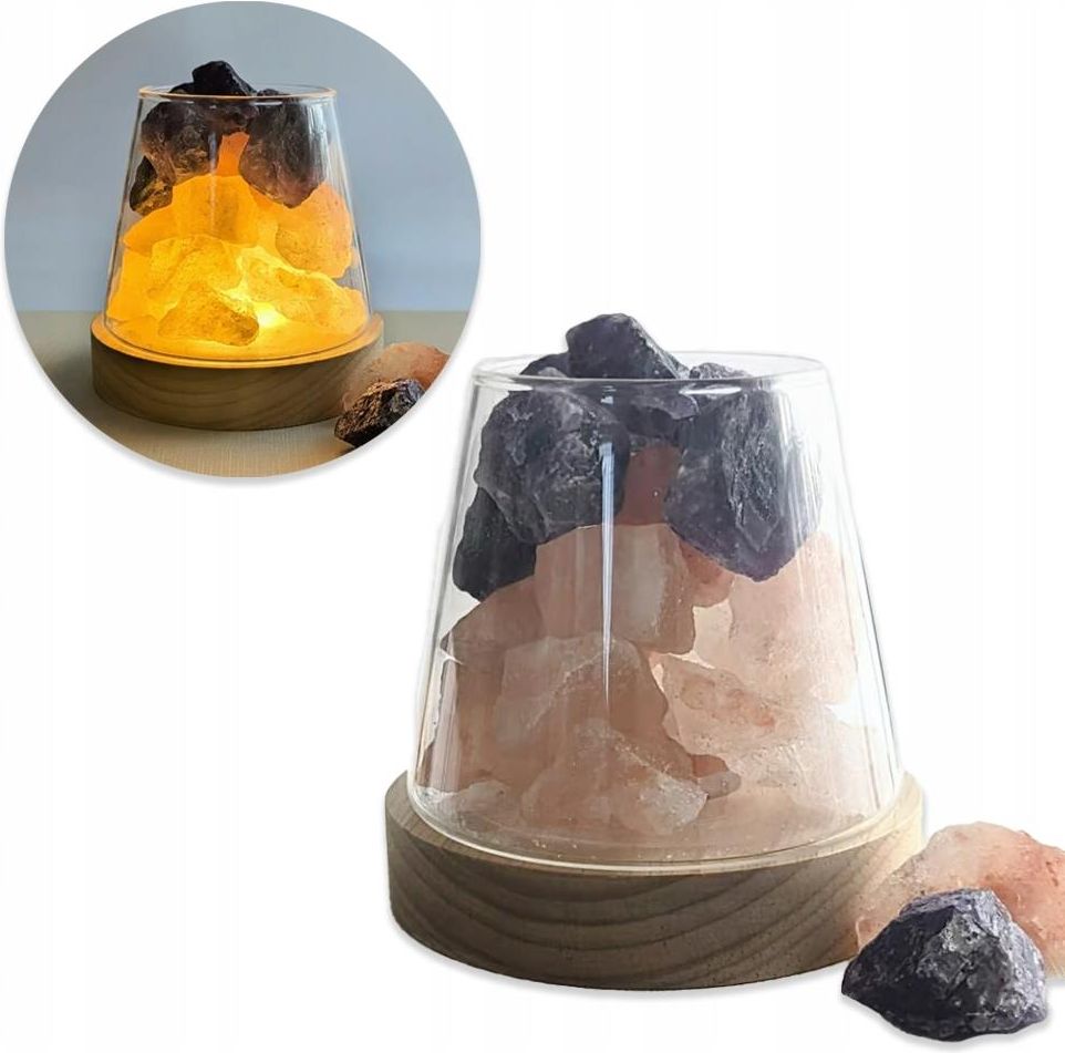 Lampa Ozdobna Lampka Stojąca Biurkowa Stołowa Nocna Lampa USB z Kamieniami Specyfikacja Wysokość: ok. 10 cm Średnica podstawki: ok. 10 cm Waga: ok. 400 g (z kryształami) Zasilanie: biały kabel USB 0,7 m Podstawa: drewniana z wbudowanym oświetleniem LED Klosz: szklany, zwężający się ku górze Kamienie: surowe bryłki, sól himalajska i ametyst Zawartość zestawu: podstawa z LED i kablem USB, szklany klosz, zestaw kamieni naturalnych Lampka Dekoracyjna Cechy Naturalne minerały: każdy zestaw zawiera autentyczne kamienie o unikalnym układzie barw i struktur. Ciepłe światło LED: tworzy przytulną atmosferę – idealną do relaksu, medytacji i wieczornego wyciszenia. Elegancki design: połączenie drewna, szkła i kamieni to subtelna dekoracja, która harmonizuje przestrzeń. Zalety Aromaterapia i relaks: wystarczy skropić kamienie ulubionym olejkiem, by otoczyć się zapachem spokoju i ukojenia. Oczyszczenie energii: minerały wspierają równowagę emocjonalną, przyciągają dobre wibracje i rozpraszają napięcia. Światło harmonii: ciepły blask sprzyja odprężeniu, koncentracji i regeneracji po dniu pełnym obowiązków. Uniwersalne zastosowanie: doskonała do sypialni, salonu, biura, gabinetu medytacji lub strefy relaksu. Wyjątkowy prezent: estetyczny, funkcjonalny i symboliczny – idealny dla osób ceniących naturę i spokój. Lampka Nocna Ozdobna z Kamieniami Sól Himalajska + Ametyst Kolorystyka: pomarańczowo-fioletowa – jak zachód słońca. Właściwości: sól himalajska oczyszcza powietrze i wprowadza równowagę, a ametyst uspokaja i wspiera sen. Razem tworzą aurę ochrony, duchowego spokoju i harmonii emocji. Jak używać lampy? Umieść kamienie w szklanym kloszu na drewnianej podstawie. Podłącz lampę do źródła zasilania (USB). Skrop kamienie kilkoma kroplami olejku eterycznego. Ciesz się przyjemnym światłem i zapachem, który otuli Twoje wnętrze.