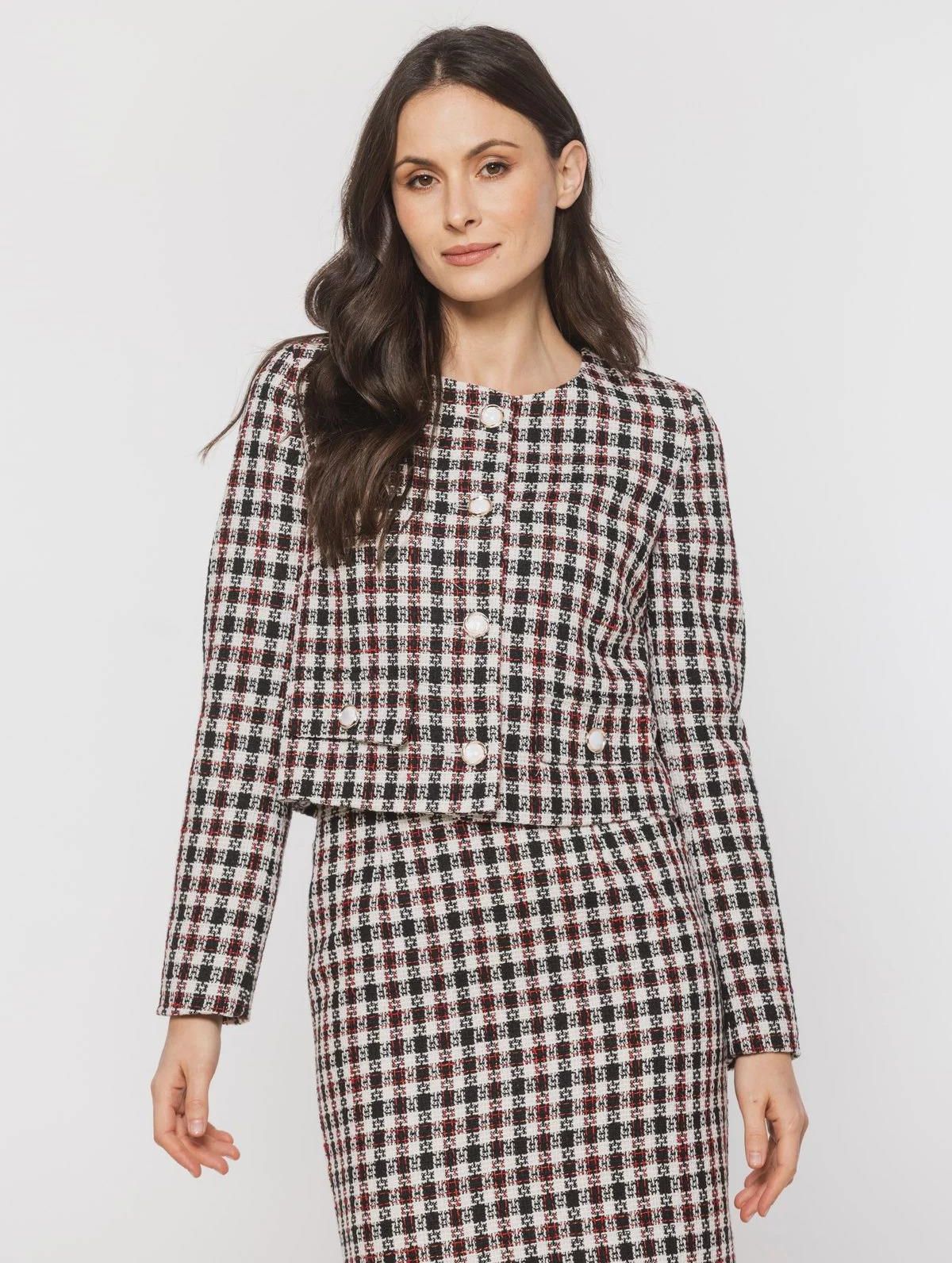 Marynarka z tkaniny boucle Podkreśl swój profesjonalizm i wyrafinowany styl dzięki naszej eleganckiej marynarce z tkaniny typu boucle w kolorze ciemnym granatowym. Ten starannie skrojony model charakteryzuje się dopasowanym, lecz nie krępującym ruchów fasonem z elementami pudełkowego kroju. Krótka długość subtelnie akcentuje talię, a lekko zaznaczone ramiona nadają sylwetce struktury i elegancji. Okrągły dekolt dodaje marynarce subtelnej kobiecości, a ozdobne guziki w dopasowanym odcieniu stanowią wyrafinowany detal. Ten stylowy żakiet idealnie dopełni zarówno formalne, jak i bardziej eleganckie, codzienne stylizacje. Tkanina: 80% poliester, 20% bawełna Skład podszewki: 94% poliester, 6% elastan Rodzaj marynarki: krótka, jednorzędowa zapinana na cztery duże, ozdobne guziki Kolor główny: czarna, biała i czerwona kratka Producent: Willsoor Gwarancja: 24 m-ce Uszyta w Polsce
