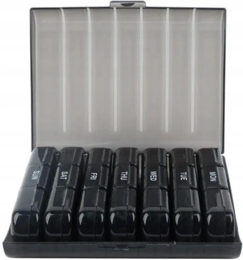 Pojemnik Na Tabletki Organizer Na Leki Kasetka Poranek-Dzień-Wieczór-Noc - ViO, PPB-03 Plastikowy organizer na tabletki Ranek-Dzień-Wieczór to praktyczny i niezawodny dodatek do przechowywania i porządkowania leków, witamin i suplementów diety. Jest przeznaczony dla osób, które chcą uniknąć zamieszania i zapomnianych dawek, zwłaszcza jeśli harmonogram przyjmowania leków obejmuje kilka razy dziennie. Jego główną zaletą jest podział przegródek na trzy główne pory dnia: poranek, dzień i wieczór. Taka organizacja pozwala łatwo i szybko znaleźć odpowiednią dawkę w odpowiednim momencie. Każdy pojemnik odpowiada jednemu dniu tygodnia, więc można przygotować wszystkie niezbędne leki z wyprzedzeniem na 7 dni. Komory mają zrozumiałe oznaczenia – symbole słońca i księżyca pomagają szybko zorientować się nawet osobom z osłabionym wzrokiem lub starszym użytkownikom. Pojemnik Na Tabletki Organizer Na Leki - wytrzymała i ergonomiczna konstrukcja do codziennego użytku Organizer wykonany jest z wysokiej jakości plastiku spożywczego, bezpiecznego do przechowywania leków. Materiał jest odporny na zużycie, nie pęka i nie odkształca się z upływem czasu, co gwarantuje długotrwałe użytkowanie. Pokrywki każdej przegródki są szczelnie zamocowane, co zapobiega przypadkowemu otwarciu i wysypaniu się zawartości podczas transportu. Kompaktowe wymiary pozwalają wygodnie zabrać organizer ze sobą w podróż, do pracy lub na naukę. Z łatwością mieści się w torbie lub plecaku, zajmując minimum miejsca. Warianty wzornicze obejmują zarówno klasyczny czarny kolor z wyraźnym kontrastowym oznaczeniem, jak i jasne wersje kolorystyczne, które sprawiają, że użytkowanie jest jeszcze wygodniejsze i przyjemniejsze. Zalety użytkowania Kasetka Ranek-Wieczór Trzy przegródki na dzień – idealny podział na poranek, dzień i wieczór, aby dokładnie przestrzegać harmonogramu przyjmowania leków. Organizacja tygodniowa – pełna kontrola nad przyjmowaniem leków przez 7 dni. Ergonomiczność – wygodne otwieranie nawet dla osób z ograniczoną sprawnością ruchową rąk. Niezawodna ochrona – szczelne zamknięcie pokrywek zapobiega przedostawaniu się kurzu, wilgoci i przypadkowemu otwarciu. Higieniczność – łatwo się myje i szybko schnie, nie pochłania zapachów. Kompaktowość – zajmuje minimum miejsca i nadaje się do podróży. Przejrzystość wizualna – symbole i podpisy pomagają szybko znaleźć odpowiednią przegródkę. Plastikowy organizer na tabletki Ranek-Dzień-Wieczór to prosty, a jednocześnie bardzo skuteczny sposób na utrzymanie dyscypliny w przyjmowaniu leków. Nadaje się zarówno do użytku osobistego, jak i dla opiekunów, którzy kontrolują przyjmowanie leków przez swoich bliskich. Dzięki przemyślanej konstrukcji, wysokiej jakości materiałom i funkcjonalności, ten organizer stanie się niezawodnym pomocnikiem w codziennej pielęgnacji zdrowia.