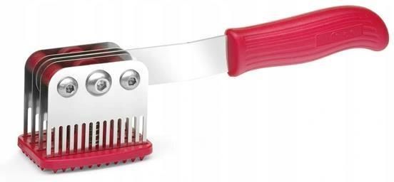 Tłuczek siekacz nakłuwacz do zmiękczania mięsa 56 Hendi Kod producenta: 513071 Tłuczek do zmiękczania mięsa marki Victor to połączenie maszynki do zmiękczania mięsa z tradycyjnym tłuczkiem. Doskonale rozbija mięso oraz zmiękcza masę włóknistą i jednocześnie spłaszcza mięso. Posiada 56 ostrzy o szerokości 2,6 mm wykonanych ze stali nierdzewnej. Maksymalna głębokość nacięcia to około 18 mm. Cechy produktu: - Połączenie maszynki do zmiękczania z tradycyjnym tłuczkiem, - Doskonale rozbija mięso, zmiękcza masę włóknistą i jednocześnie spłaszcza mięso, - 56 ostrzy - 4 rzędy po 14 ostrzy, - Ostrza ze stali nierdzewnej, - Szerokość ostrzy 2,6 mm, - Maksymalna głębokość nacięcia ok. 18 mm. Dane techniczne: - Nr produktu - 513071 - Stan artykułu - Nowy - Kolor - Czerwony - Materiał ostrzy - Stal nierdzewna - Ilość ostrzy - 56 - Szerokość ostrzy - 2,6 mm - Głębokość nacięcia - ok. 18 mm - Wymiary - 280 x 57 x 70 mm - Waga - 350 g W zestawie: - Tłuczek szefa kuchni Kod producenta: 1012262 Kod producenta: 513071 Tłuczek do zmiękczania mięsa marki Victor to połączenie maszynki do zmiękczania mięsa z tradycyjnym tłuczkiem. Doskonale rozbija mięso oraz zmiękcza masę włóknistą i jednocześnie spłaszcza mięso. Posiada 56 ostrzy o szerokości 2,6 mm wykonanych ze stali nierdzewnej. Maksymalna głębokość nacięcia to około 18 mm. Cechy produktu: - Połączenie maszynki do zmiękczania z tradycyjnym tłuczkiem, - Doskonale rozbija mięso, zmiękcza masę włóknistą i jednocześnie spłaszcza mięso, - 56 ostrzy - 4 rzędy po 14 ostrzy, - Ostrza ze stali nierdzewnej, - Szerokość ostrzy 2,6 mm, - Maksymalna głębokość nacięcia ok. 18 mm. Dane techniczne: - Nr produktu - 513071 - Stan artykułu - Nowy - Kolor - Czerwony - Materiał ostrzy - Stal nierdzewna - Ilość ostrzy - 56 - Szerokość ostrzy - 2,6 mm - Głębokość nacięcia - ok. 18 mm - Wymiary - 280 x 57 x 70 mm - Waga - 350 g W zestawie: - Tłuczek szefa kuchni Kod producenta: 1012262 Hendi