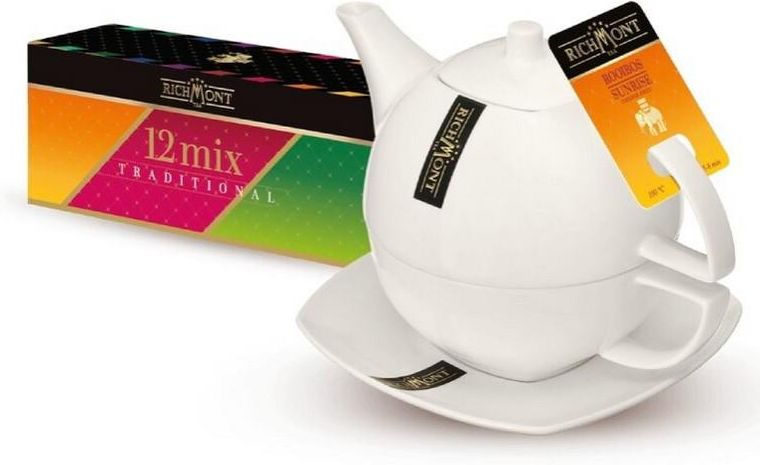 Richmont Duo + herbaty Porcelanowy zestaw do parzenia herbaty Richmont Duo to elegancki zestaw do parzenia herbaty, który zamieni codzienny rytuał w wyjątkowe doświadczenie. W skład zestawu wchodzi porcelanowy czajnik o pojemności 450 ml, idealnie dopasowany do parzenia herbat Richmont. Dzięki praktycznemu uchu dzbanka, saszetkę z herbatą można wygodnie przymocować, co ułatwia precyzyjne parzenie – dobierając odpowiednią temperaturę wody i czas. Do kompletu dołączona jest filiżanka ze spodkiem, która nagrzewa się w trakcie parzenia, zapewniając idealną temperaturę naparu. Wysoka jakość i stylowy design Zestaw wykonany jest z wysokiej jakości porcelany i charakteryzuje się wyjątkowym, eleganckim designem. Idealnie komponuje się z wnętrzami restauracji, biur czy domowych kuchni. Dzbanek Richmont Duo pozwala zaparzyć herbatę, która wystarcza na wypełnienie dwóch filiżanek, co czyni go doskonałym wyborem zarówno na spotkania, jak i chwilę relaksu w pojedynkę. Zestaw herbat Richmont Zestaw Richmont Duo jest dostępny także w komplecie z 12 saszetkami herbat w różnych smakach. Dzięki temu możesz odkrywać bogactwo aromatów – od wyrazistych herbat czarnych, przez delikatne zielone, po intensywne mieszanki owocowe i kojące napary ziołowe. To świetna okazja do wypróbowania najlepszych kompozycji marki Richmont. Dla domu, biura i gastronomii Richmont Duo to idealny wybór dla miłośników herbaty, niezależnie od miejsca. Świetnie sprawdzi się w domu, biurze, a także w lokalach gastronomicznych, wszędzie tam, gdzie parzenie herbaty to chwila warta celebrowania. Dzięki połączeniu funkcjonalności i estetyki zestaw ten jest także doskonałym pomysłem na prezent dla każdego konesera herbaty. Zestaw Richmont Duo zawiera Porcelanowy dzbanek do parzenia herbaty o pojemności 450 ml Porcelanowa filiżanka ze spodkiem o pojemności 200 ml W skład zestawu herbat wchodz (po 1saszetce)i: Richmont Ceylon Gold Richmont English Breakfast Richmont Earl Grey Richmont Rooibos Sunrise Richmont Gunpowder Green Richmont Green Jasmine Richmont Peppermint Green Richmont White Pearl Of Fujian Richmont Forest Fruits Richmont Mexican Dream Richmont Peach Lemon Star Richmont Yerba Mate