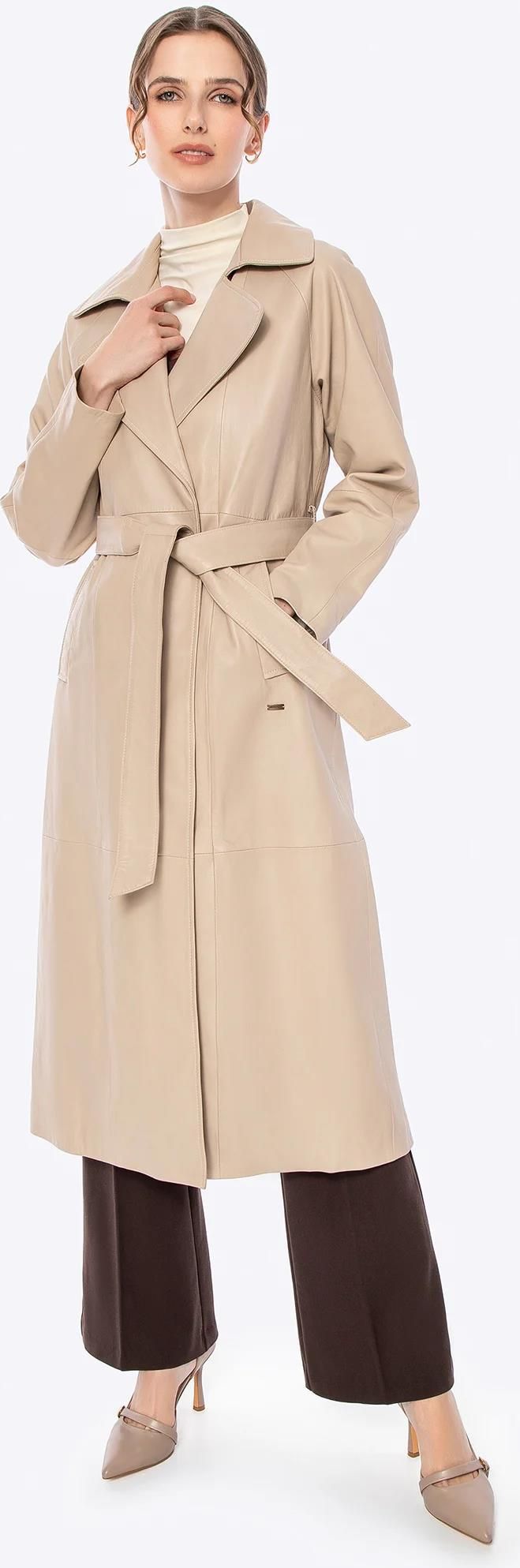 Skórzany damski płaszcz z paskiem kremowy Józefów