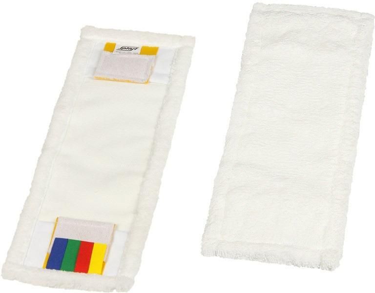 Splast nakładka do mopa z mikrofazy Kombi 40cm 1. ciężar: ok. 120 g w tym: - waga tkaniny: ponad 90% - waga pozostałych materiałów: mniej niż 10% 2. skład: - tkanina: 90% mikrofaza poliestrowa, 10% poliester - nić: 100% poliester - kieszenie: 100% poliester - uszy: 33% poliester, 67% PVC 3. kurczliwość: < 4% 4. max. temp. prania: 60°C 5. zalecana temp. prania: 60°C 6. wchłanianie wody: ponad 400% ciężaru własnego 7. odporność na pranie: ok. 300 prań 8. do stosowania z: - Szczotka płaska KLIK MONO 40 cm (SZCZ-0011), - Szczotka płaska KLIK SUPER 40 cm (SZCZ-0015), - Szczotka płaska KLIK KOMBI 40 cm (SZCZ-0024), - Szczotka płaska szaro/ pomarańczowa 40 cm M 02 (SZCZ-0001), - Szczotka płaska niebiesko/czerwona 40 cm M 02/1 (SZCZ-0009)