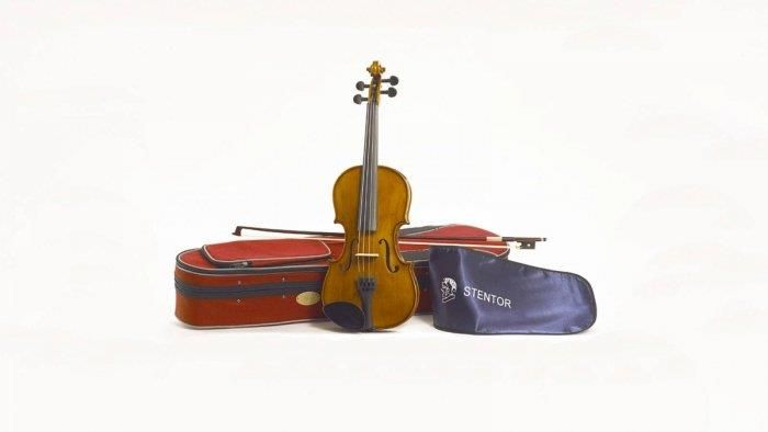 STENTOR SR1500F skrzypce 1/4 z futerałem i smyczkiem SPECYFIKACJA: wykonanie ręczne mocna świerkowa płyta wierzchnia mocny klonowy boczek mocna klonowa płyta spodnia mocna klonowa szyjka podstrunnica z drewna hebanowego wysokiej jakości kołki z drewna hebanowego podbródek z drewna twardego lżejszy strunnik z czterema mikrostroikami ozdobna żyłka smyczek z brazylijskiego drewna, z prawdziwym końskim włosiem i ładnie uformowaną żabką z hebanowego drewna lekki futerał z ciemnoczerwonym materiałem zewnętrznym, kieszenią na nuty, elementami odblaskowymi i paskiem na ramię