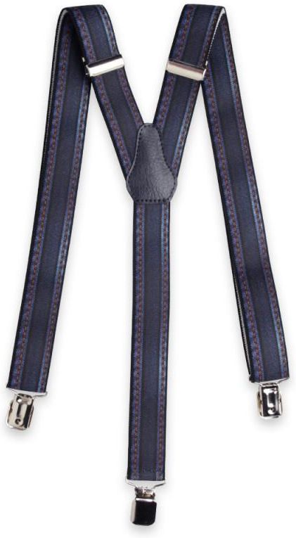 Klasyczne granatowe szelki męskie denim z pomarańczowym przeszyciem i zapięciem na żabki