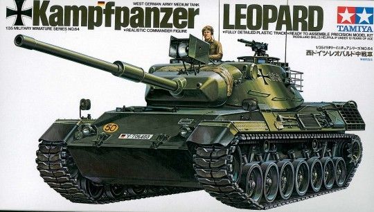 TAMIYA 35064 1:35 Kampfpanzer Leopard Medium Tank Tamiya Firma: Tamiya Skala: 1:35 Numer katalogowy: 35064 EAN: 4950344996384 Plastikowy model do sklejania w skali. Zestaw NIE zawiera kleju, narzędzi, farb ani pędzelka. Do sklejenia modelu potrzebne będą NARZĘDZIA i FARBY modelarskie (akrylowe lub emalia): do wycinania np.: cążki, nożyk do ścierania nadlewek plastiku po wycięciu np.: pilniczek, papier ścierny do klejenia / składania drobnych elementów: pęseta, klej modelarski do dokładnego malowania: taśmy maskujące, pędzle (szerszy do większych powierzchni i wąski do detali) do utrzymania porządku: mata modelarska do przechowywania: gablotka Krótka historia Leopard 1 jest współczesnym, niemieckim czołgiem podstawowym II generacji. Pierwsze prototypy pojazdu powstały w 1961 roku, a produkcja seryjna trwała w latach 1965-1979, kończąc się wytworzeniem ponad 4700 czołgów. Leopard 1 powstał w odpowiedzi na zapotrzebowanie na nowy czołg podstawowy ogłoszone przez Bundeswehrę w 1956 roku. Nowy wóz miał zastąpić czołgi produkcji amerykańskiej M47 i M48. Szczegóły modelu Jest to plastikowy model do sklejania w skali 1/35 przedstawiający Leoparda, pierwszy czołg wyprodukowany w kraju przez byłe Niemcy Zachodnie. Od potężnego działa 105 mm po wyrafinowane linie, forma czołgu została uchwycona w wielkim stylu Zawiera realistyczne odtworzenie odlewanych metalowych powierzchni oraz metalowych elementów osłony silnika W zestawie jedna figurka tułowia i kalkomanie do dekoracji. Proponowane niezbędne farby przez producenta do pomalowania modelu: Pojazd: Tamiya XF-62 lub spray TS-5 (pancerz) Tamiya XF-1 (elementy gumowe) Tamiya XF-56 (KM, liny, narzędzia) Dowódca: Tamiya XF-62 (mundur) Tamiya XF-10 (beret, pas) Tamiya XF-1 (buty, słuchawki) Tamiya XF-15 (skóra)