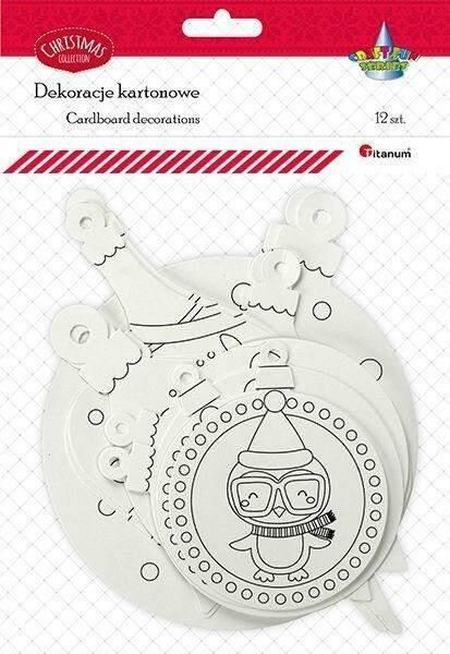 Dekoracje kartonowe do kolorowania - 12 sztuk od Titanum Kreatywne zawieszki w formie bombek to doskonała opcja dla osób, które chcą dodać własnego, niepowtarzalnego wyrazu swojej choinkowej dekoracji. Wykonane z kartonu, dają niemal nieograniczone możliwości ozdabiania, a ich kształt nawiązuje do tradycyjnych bombek.Wybierz dowolną technikę malowania - zawieszki można pomalować za pomocą farb, kredkami lub flamastrami, a także ozdobić je wyklejając kolorowymi papierami. Dostosuj sposób zdobienia do swoich umiejętności i gustu, a efekt końcowy z pewnością będzie spektakularny.Zestaw zawiera 6 różnych wzorów, po 2 sztuki od każdego wybranego motywu, co pozwoli na urozmaicenie aranżacji świątecznej. Wymiary zawieszek są zróżnicowane - od 80 do 165 mm, co pozwala na wyeksponowanie każdego wzoru na drzewku.Kolor podstawowy to biały, dzięki czemu zawieszki są wyjątkowo uniwersalne i dobrze komponują się z innymi ozdobami choinkowymi. W opakowaniu znajduje się łącznie 12 sztuk, co wystarczy na przyozdobienie nawet większych choinek. Koloryzacja i wykończenie bombek zależy tylko i wyłącznie od twojej wyobraźni!Dekoracje kartonowe do kolorowania oferują nie tylko niepowtarzalną ozdobę, ale również świetną zabawę podczas wspólnego przygotowywania się na święta. Daj się porwać twórczej pasji i spraw, aby twoja choinka wyglądała niezwykle oryginalnie! EAN: 5907437721520