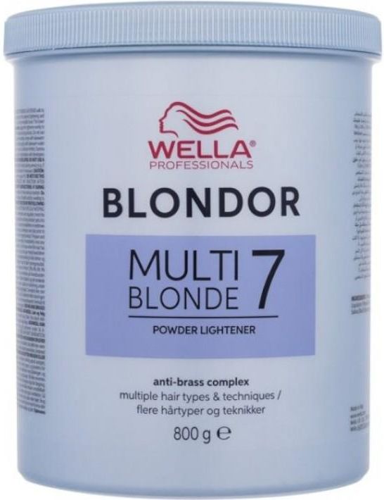 WELLA Blondor Multi Blonderozjaśniacz w proszku opakowanie 800 g. Przeznaczony do profesjonalnego rozjaśniania włosów. Idealny do wszystkich technik odbarwiania. Nie pozostawia żółtych odcieni, rozjaśnia nawet do 7 tonów. Blondor ma konsystsencje pasty, dzięki czemu dobrze przylega do włosów. Jego zaawansowana formuła, wzbogacona o Protec-Keratin Complex, zapewnia ochronę włosów podczas procesu rozjaśniania. Dzięki Blondor Multi Blonde Powder, można uzyskać świetne wyniki rozjaśniania nawet na ciemnych włosach. Produkt łatwo się miesza i aplikuje, co ułatwia pracę stylistom. Rozjaśniacz jest idealnym wyborem dla osób, które chcą uzyskać efekt naturalnego, jasnego odcienia włosów. Rezultat: Skutecznie rozjaśnia włosy Umożliwia zmianę koloru nawet o 7 tonów Należy łączyć go z Wella Blondor Freelights Developer Razem tworzą zwartą emulsję, która ułatwia aplikację Nie obsypuje się i nie przemieszcza Pozytywnie wpływa na kondycję włosów Sposób użycia: Puder rozjaśniający należy zmieszać z wybrany oksydantem Wella Blondor Freelights Developer (6%, 9% lub 12%) w proporcjach 1:1,5 lub 1:2. Jeżeli zdecydowałaś się na koloryzację przy skalpie, użyj oxydantu 6%. Przygotowaną mieszankę nakładaj na suche włosy. Czas oczekiwania uzależniony jest od pożądanego efektu stylizacji, nie może jednak przekraczać 50 minut, a co 5-10 minut należy kontrolować postępy w zmianie koloru. Po upływie określonego czasu dokładnie spłucz włosy. Podczas przygotowywania i aplikowania mieszanki nie używaj metalowych narzędzi. Środki ostrożności: Produkt może wywołać reakcję alergiczną. Nie należy używać, jeśli skóra głowy jest wrażliwa, podrażniona lub uszkodzona. Nie stosować do farbowania brwi i rzęs. Chronić oczy. W razie dostania się produktu do oczu natychmiast przepłukać wodą. Chronić przed dziećmi. Stosować zgodnie z instrukcją użycia. Używać odpowiednich rękawiczek ochronnych. Aby zachować właściwe działanie produktu zamykaj pojemnik dokładnie po każdym użyciu. Nie robić trwałej ondulacji bezpośrednio przed lub po koloryzacji. Nie stosować, jeśli włosy były wcześniej farbowane farbami zawierającymi sole metali. Nie używać metalowych miseczek i mieszadełek do mieszania. Podczas aplikacji nie używać metalowych narzędzi. Mieszankę natychmiast zużyć. Nie przekraczać podanego czasu działania. Po zastosowaniu dobrze spłukać włosy. Natychmiast spłukać, jeśli mieszanka skapnie na skórę lub ubranie. Wyrzucać tylko puste opakowania. Przechowywać w suchym i chłodnym miejscu. Stosować się do instrukcji użycia i wskazówek ostrzegawczych.
