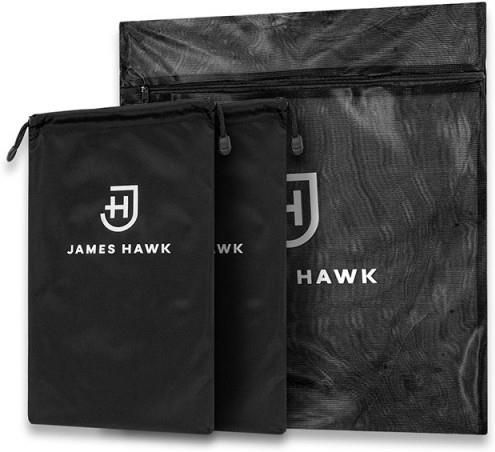 Zestaw pokrowców ochronnych (Travel Set) Zestaw trzech praktycznych pokrowców ochronnych z wodoodpornego, ultralekkiego materiału. Lepszą organizację bagażu zapewnią dwie torby na obuwie oraz jedna torba na brudną odzież. Kolor: czarna Wymiary: torba na brudną odzież – wymiary: 50 cm x 40 cm; torby na buty – wymiary: 40 cm x 24 cm Producent: James Hawk Gwarancja: 24 m-ce