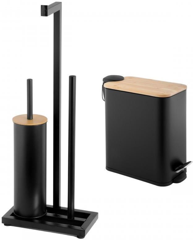 Zestaw łazienkowy czarny/bambus Stojak 3w1 Uchwyt na papier toaletowy + Szczotka do WC + Kosz na śmieci 5L z wolno opadającą klapą - Yoka Józefów