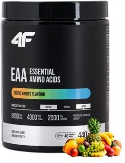 Aminokwasy EAA 4F FUEL Essential Amino ACIDS to suplement diety, aminokwasy egzogenne z witaminą B6 i niacyną, w proszku, o smaku owoców egzotycznych. Zawiera substancje słodzące.