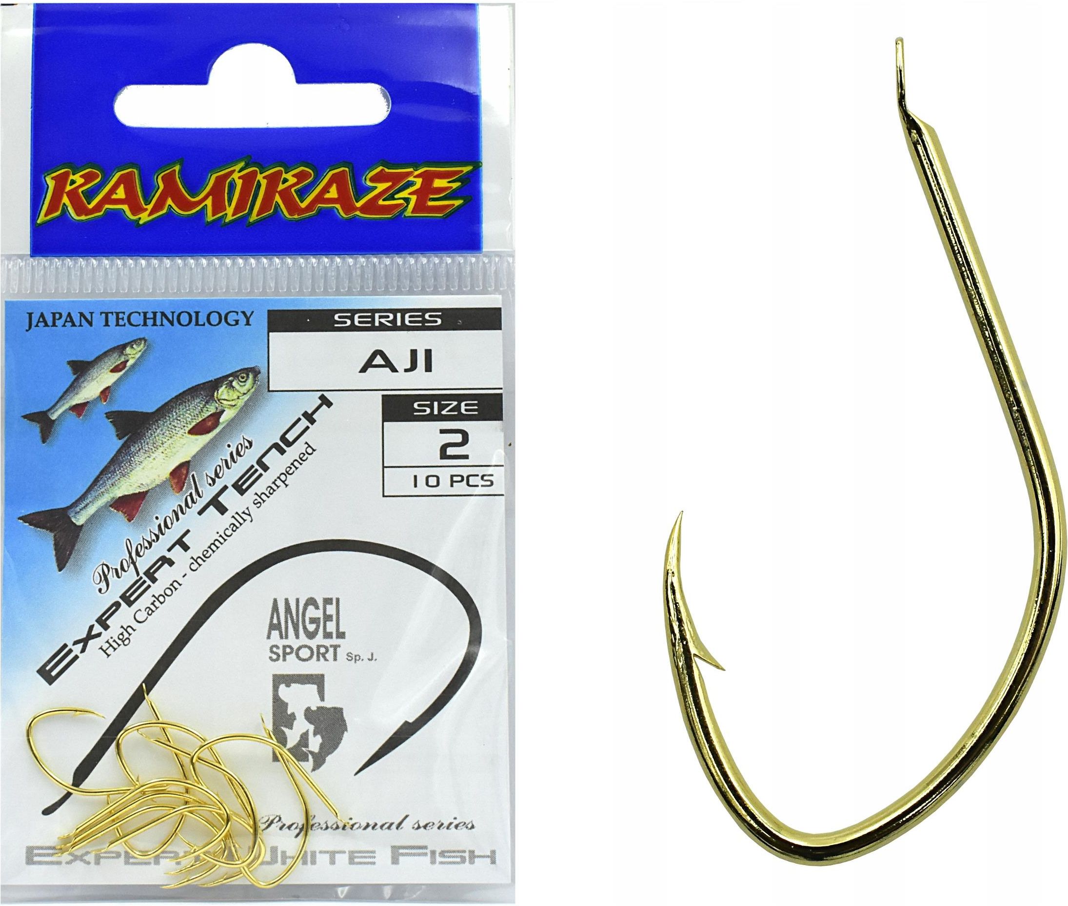 Komplet Haczyków Kamikaze AJI nr 2 (10 szt) kod produktu: HakAJI2 Parametry: serii: AJI rozmiar haka: 2 zakończenie: z łopatką typ ostrza: z zadziorem, ilość szt w opakowaniu: 10 szt materiał: stal węglowa kolor: złoty Japan Technology AJI- Profesjonalna seria bardzo mocnych i ostrych haczyków …
