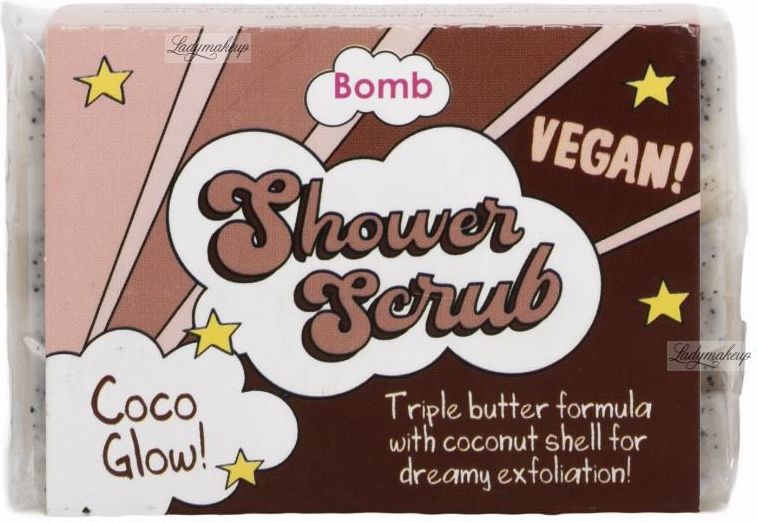 Shower Scrub - Coco Glow marki Bomb Cosmetics. Peeling do ciała. Jest w 100% wegański. Posiada wygodną formę małej kostki, przypominającej wyglądem tradycyjną kostkę mydła. Zawiera w sobie drobno zmielone łupinki kokosa, które złuszczają martwy naskórek oraz przyjemnie wygładzają naskórek, przygotowując ciało do dalszych zabiegów pielęgnacyjnych. Dodatkowo formuła została wzbogacona o pielęgnacyjny kompleks trzech maseł: shea, kakaowego oraz mango, które intensywnie nawilżają, odżywiają oraz zmiękczają skórę. Do kostki peelingującej zostały dodane specjalne olejki eteryczne: kokosowy i ylang ylang, które rozpieszczają zmysły i odprężają całe ciało. Kostka dostępna jest o pojemności 100 g. Peeling do ciała. Ma formę kosteczki. Delikatnie złuszcza naskórek. Przyjemnie nawilża i odżywia.