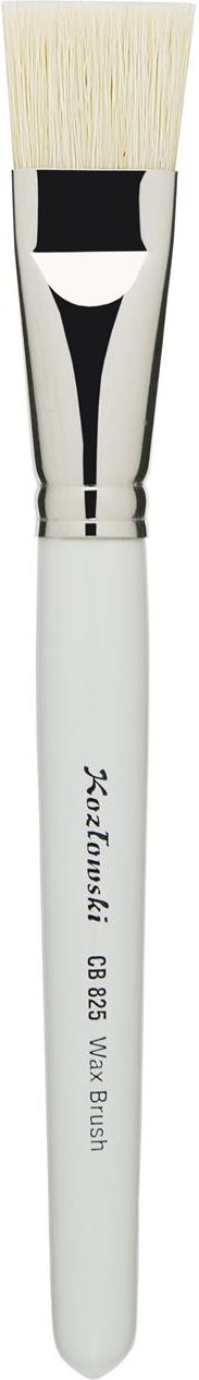 Wax Brush CB 825 marki Kozłowski. Pędzel przeznaczony jest do nakładania i zmywania masek w kremie. Naturalne włosie (szczecina) ułożono w kształcie trapezu, dzięki czemu ułatwia szybkie i równomierne nakładanie kosmetyków. Trzonek pędzla wykonano z twardego drewna. Wyprofilowana, pokryta lakierem, biała rękojeść, doskonale leży w dłonie, zapewniając komfort pracy. Włosie umieszczono w grubiej, metalowej skuwce. Główka pędzla została wykonana z naturalnej szczeciny, która należy do grupy twardego włosia. Posiada małą sprężystość.