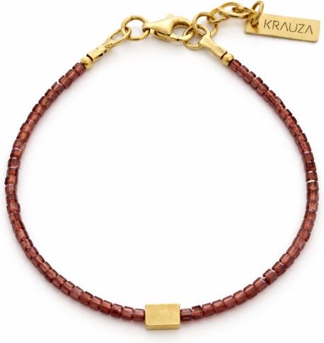 Bransoletka z naturalnymi granatami KRAUZA DESIGN – srebro pozłacane 925 Elegancka bransoletka z naturalnych granatów marki Krauza Design to ponadczasowa biżuteria o szlachetnym i wyrazistym charakterze. Drobne, fasetowane kamienie granatu zachwycają głęboką, bordowo-czerwoną barwą, która subtelnie mieni się w świetle, nadając całości elegancji i luksusowego wyrazu. Minimalistyczny design został uzupełniony geometrycznym elementem wykonanym ze srebra próby 925 pokrytego warstwą złota. Połączenie intensywnego koloru naturalnych kamieni z ciepłym odcieniem złoconych detali tworzy harmonijną i nowoczesną kompozycję charakterystyczną dla projektów KRAUZA DESIGN. Bransoletka doskonale sprawdzi się jako elegancki dodatek na co dzień, a także jako biżuteria podkreślająca wieczorowe stylizacje. Świetnie prezentuje się noszona samodzielnie lub w zestawie z zegarkiem czy innymi delikatnymi bransoletkami. Granat – kamień elegancji i klasy Granat od wieków uznawany jest za kamień symbolizujący energię, pasję oraz siłę. Jego głęboka kolorystyka sprawia, że biżuteria z granatem pozostaje zawsze modna i niezwykle uniwersalna. Specyfikacja produktu Rodzaj biżuterii: bransoletka damska z kamieni naturalnych Kamień: naturalny granat (fasetowany) Materiał: srebro próby 925 pozłacane Marka: KRAUZA DESIGN Zapięcie: karabińczyk Styl: minimalistyczny / elegancki / nowoczesny Wymiar 18-20cm Bransoletka z granatami KRAUZA DESIGN to doskonały wybór dla kobiet ceniących klasyczną biżuterię z naturalnych kamieni o wyrazistym, szlachetnym charakterze — idealna również jako elegancki prezent.
